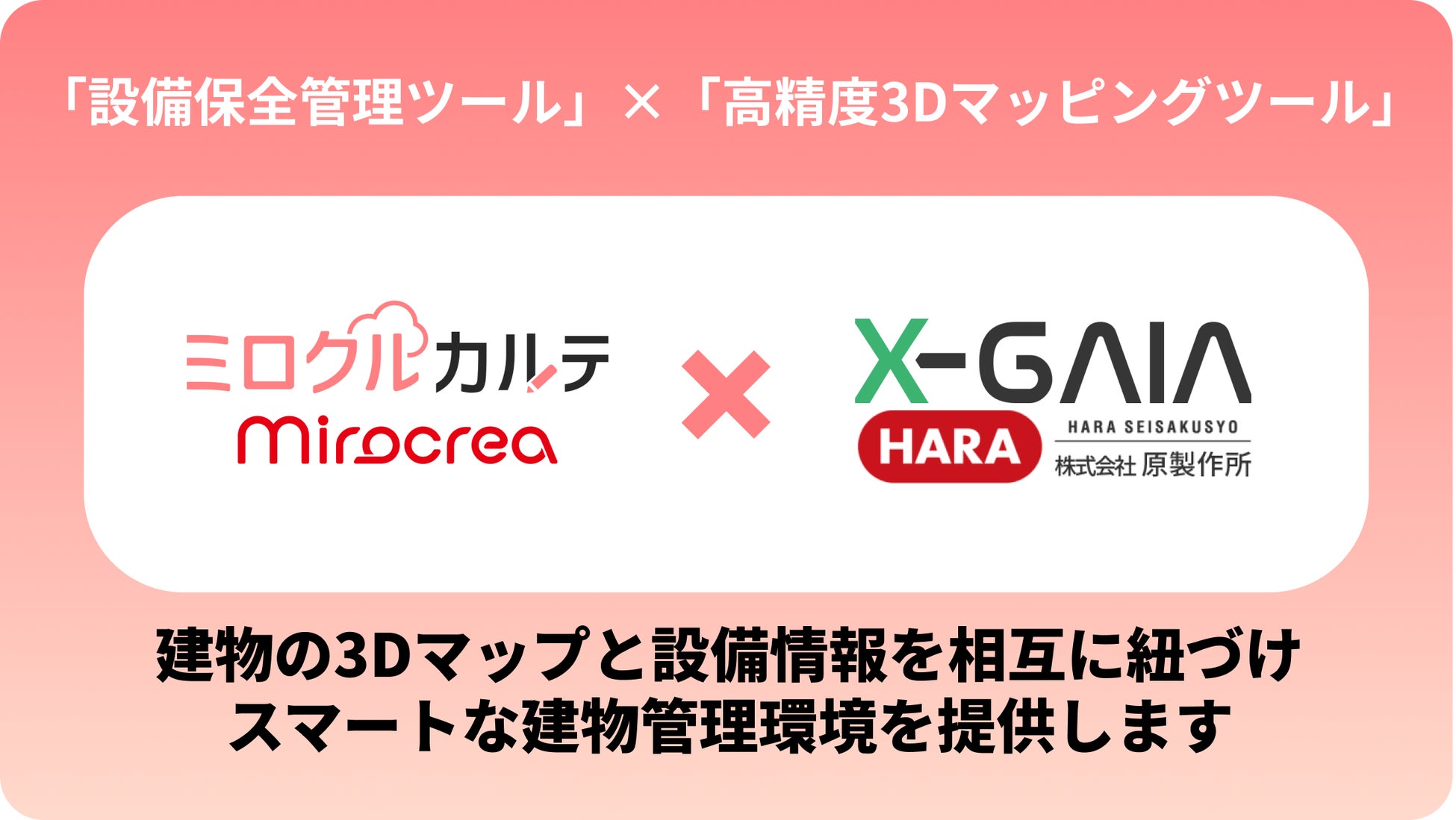 株式会社ミロクリエ(所在地:高知県南国市、代表取締役:井戸 隆雄)と株式会社原製作所(所在地:長野県上田市、代表取締役社長:原 洋介)は、設備管理システム「ミロクルカルテ」と高精度3Dマッピングツール「X-GAIA」の連携を実現しました。この革新的な連携により、建物の3Dマップと設備情報を相互に紐づけ、スマートな建物管理環境を提供します。