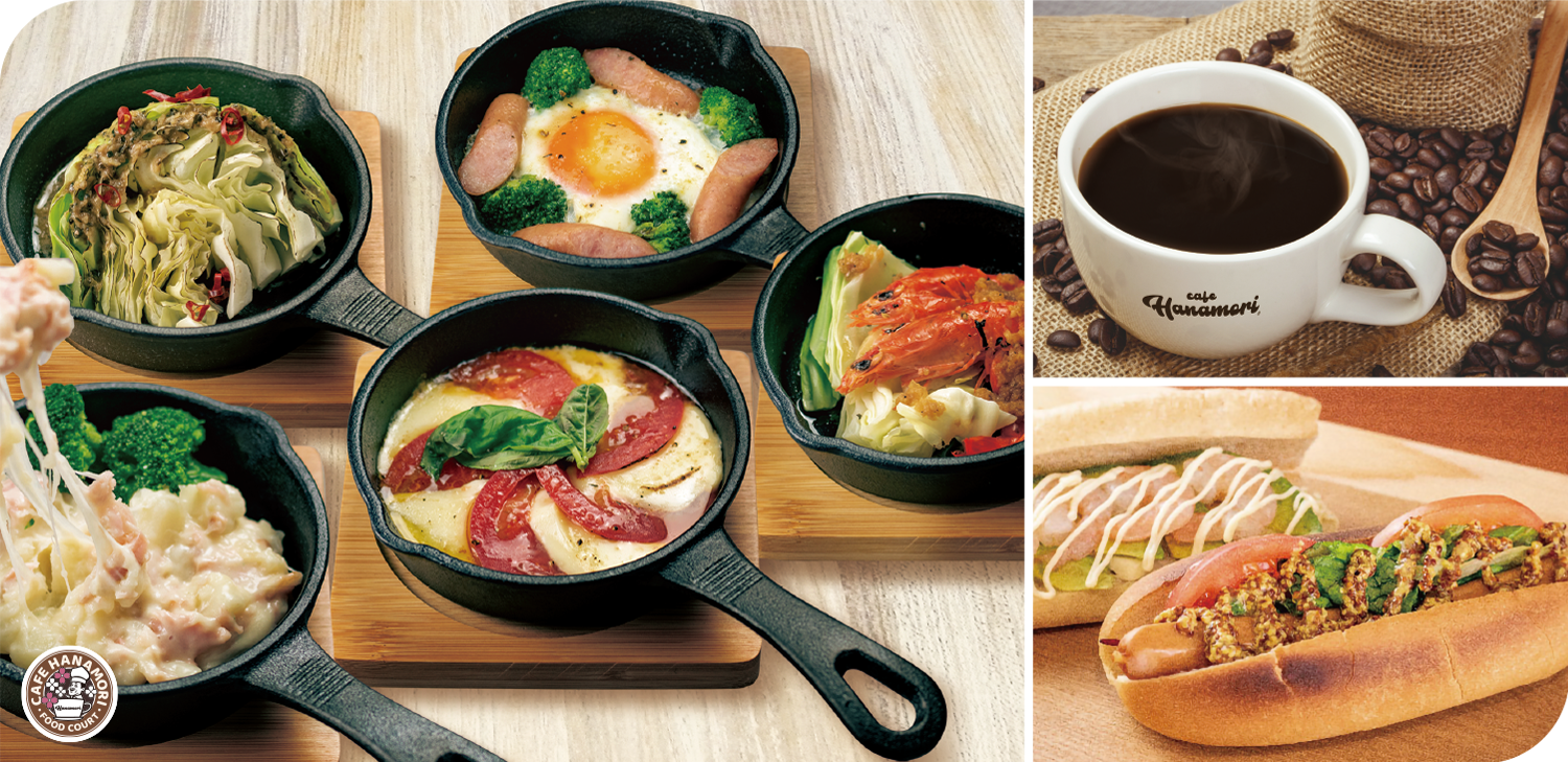 「Cafe Hanamori」では、豊富なカフェメニューやスイーツに加え、アルコール、バルメニューもご用意。フードコートのように“カフェ”の枠にとらわれない様々なサービスを1店舗で実現、東京や関東でご好評いただいてます。ホテルにご宿泊される方はもちろん、近隣住民の方にも気軽にご利用いただけるメニューを提供いたします。
