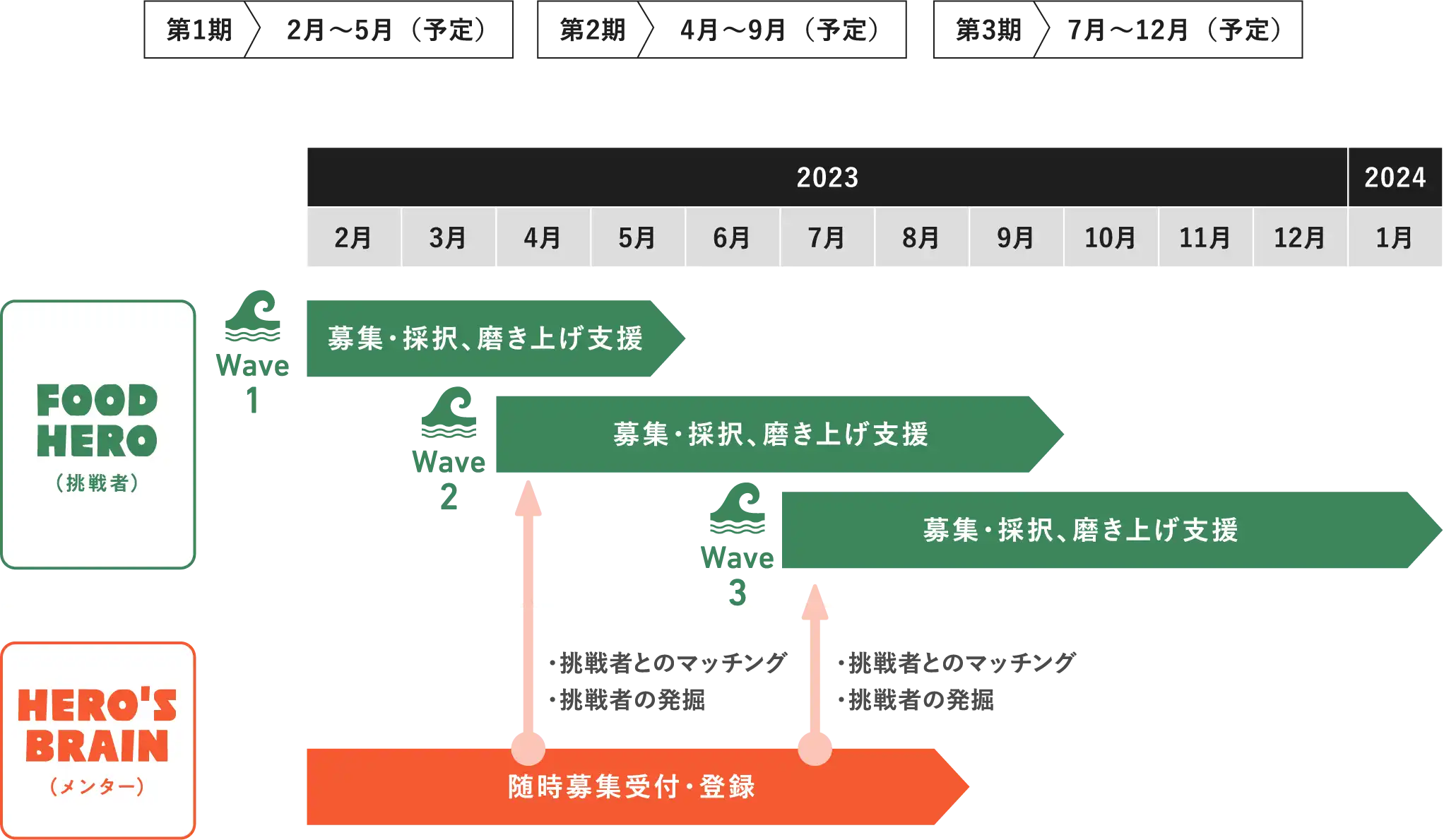 第2期(WAVE2)の募集は4月7日(金)〜5月21日(日)となります。WAVE2では、「HERO」(チャレンジ事業者)の募集に加え、ヒーローを支える「HERO’s BRAIN」も併せて募集します。