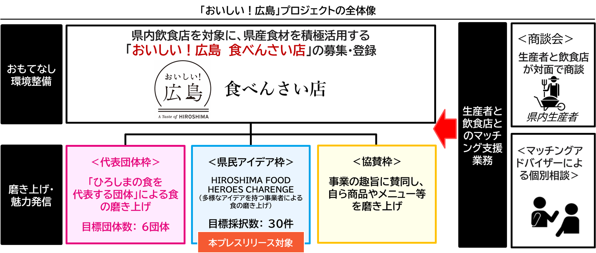 「HIROSHIMA FOOD HEROES CHALLENGE」は、広島の誇るべき一皿と食文化、それらを磨きあげ、全国そして世界へ挑戦するプログラムです。食の磨き上げに挑戦する広島の“ヒーロー”と、その挑戦をサポートするブレーン(メンター役)を広く募集し、まだ見ぬ“おいしい”の高みを目指すものです。テーマは広島県産の農林水産物であることのみで、食材を自由な発想で新しい料理や商品を生み出すチャレンジを支援するプログラムです。