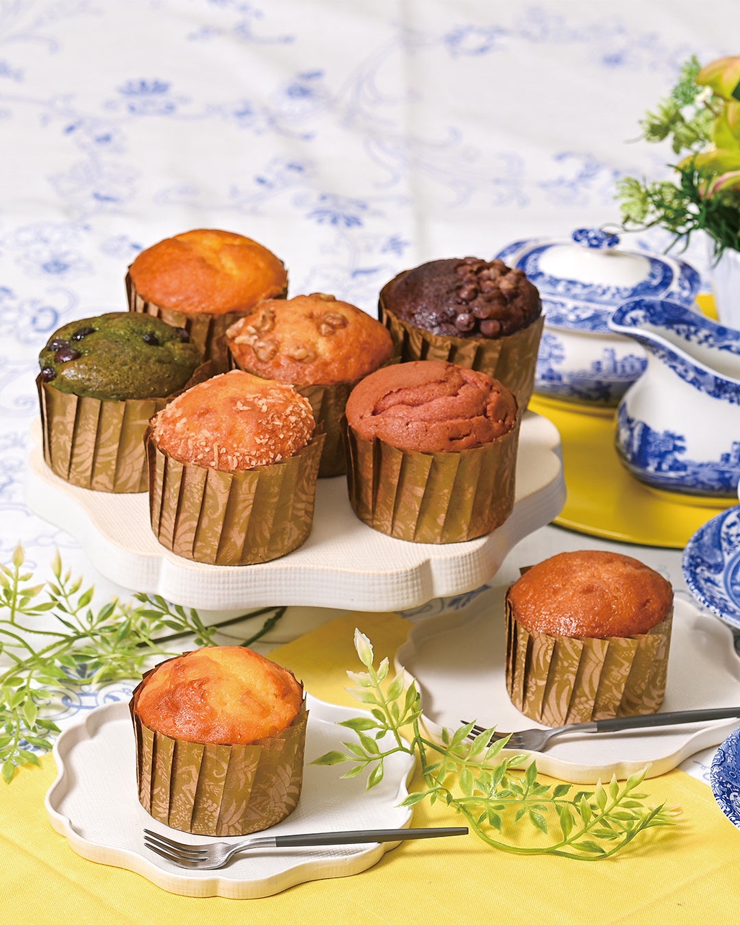 8種の味わいマフィンセットには、紅いも、チーズ、プレーン、ココナッツ、バナナ、抹茶あずき、チョコチップ、キャラメルと、個性豊かな味をラインナップ。