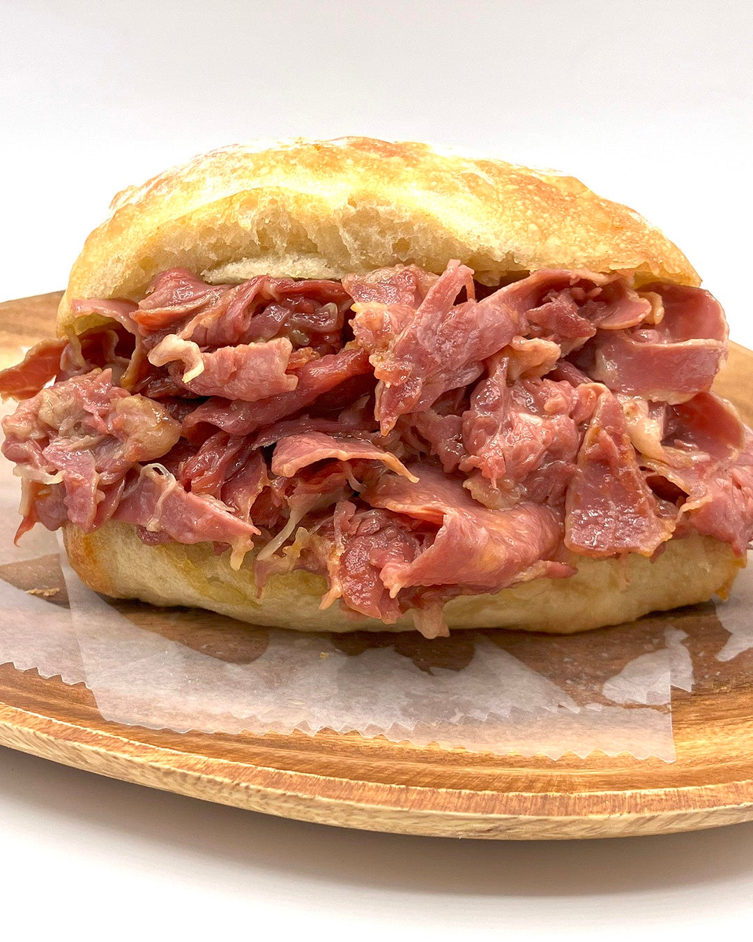 アメリカで定番の牛肉総菜「ビーフハム」を自家製造し、ボリュームたっぷりのオリジナルサンドイッチに仕上げました。脂肪が多い分、風味がとても濃厚。口の中で肉汁が溢れ出る厚さで一枚一枚スライスされ、心地よい弾力と食感が楽しめます。