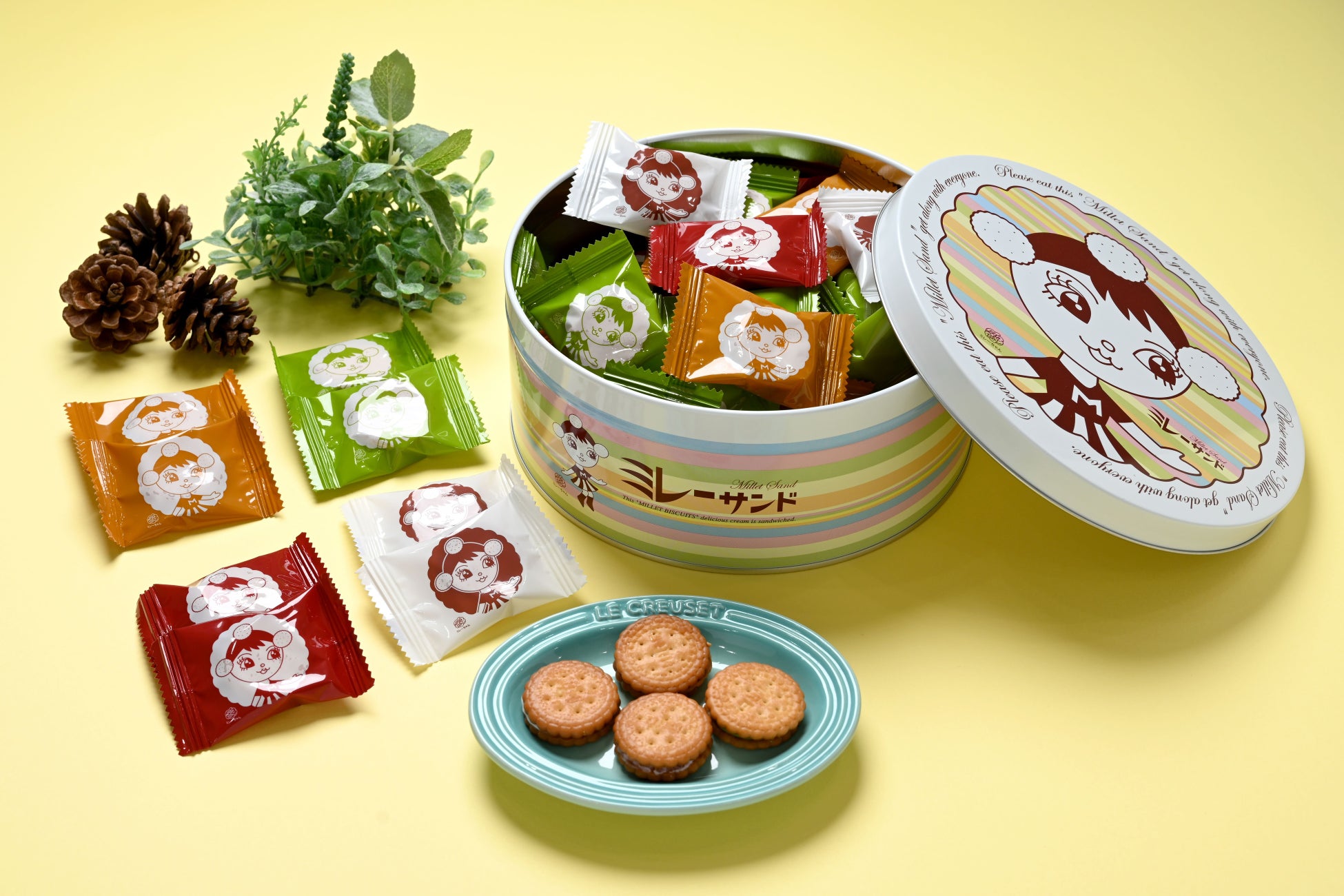 ミレービスケットのサクサク食感のまま、ミレービスケットの塩気とクリームの甘さでついついもうひとつ……とあとを引く味。個包装で、アンパンマンのやなせたかしさんがデザインした、ミレーちゃんがあしらわれた缶入り。