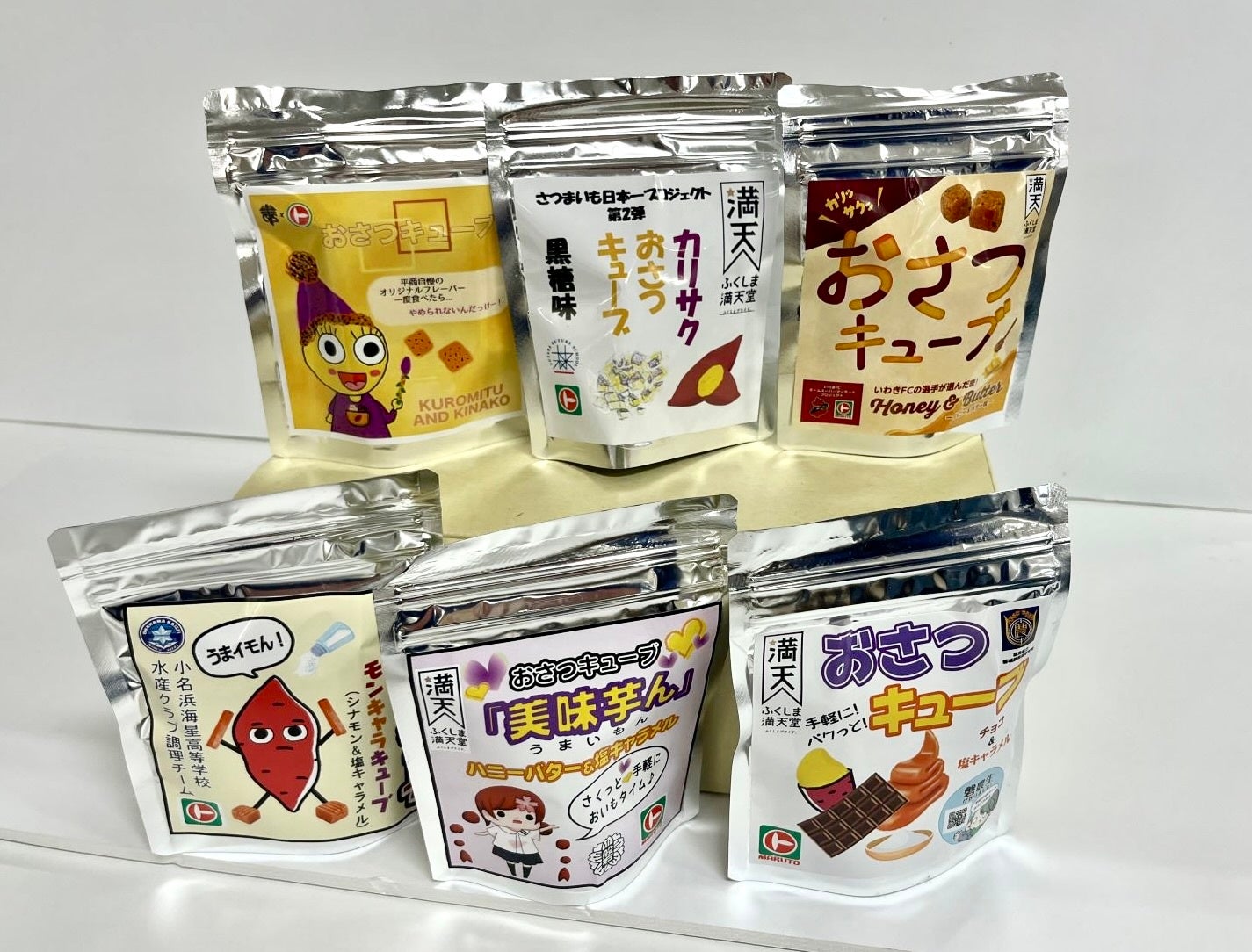 福島県内5校の生徒と地元サッカーチーム・いわきFCの選手のみなさんがそれぞれに、楢葉町の農産物のさつまいも「ふくしまゴールド」の消費拡大を目的に開発した、おさつキューブ。6種類の味のフレーバーが1箱で味わえます。