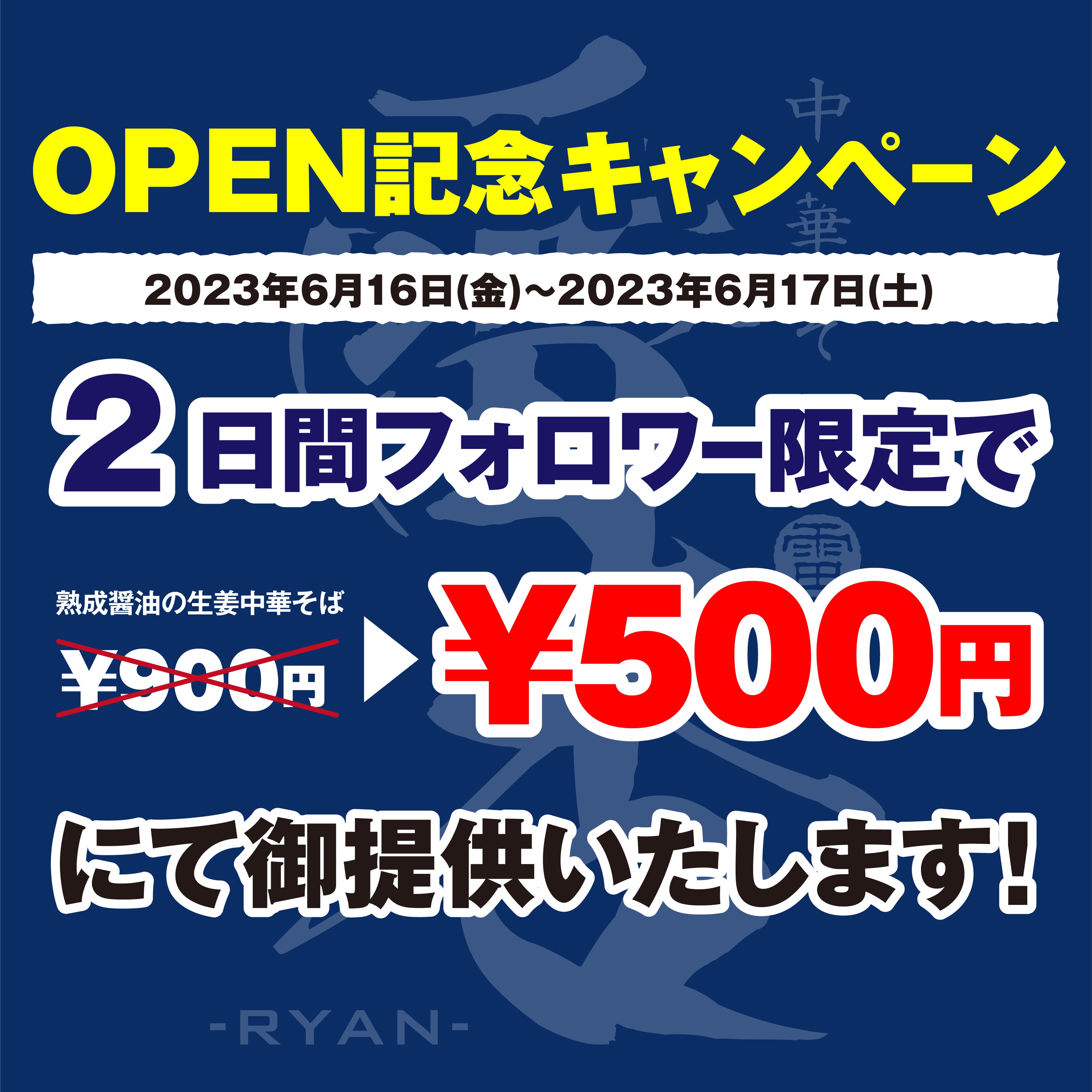 オープンから2日間、当店Instagramのフォロワー限定で「熟成醤油の生姜中華そば」900円を「500円」で提供!