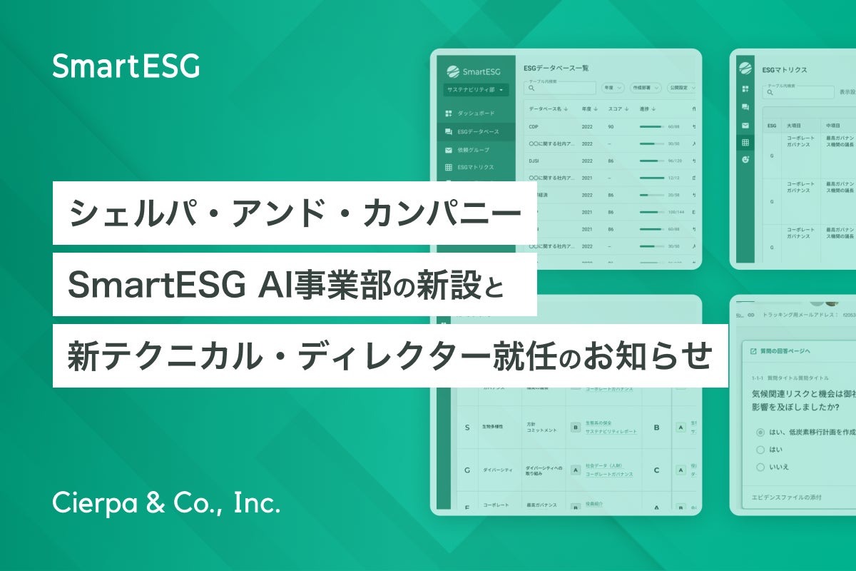 この度、シェルパ・アンド・カンパニーは、新規・既存プロダクトの開発の根幹にAI、NLP、LLM関連技術を据え、当社がパーパスとして掲げる「サステナビリティとテクノロジーをすべての経済活動の”あたりまえに”」を追求すべく、SmartESG AI事業部を本格的に立ち上げます。