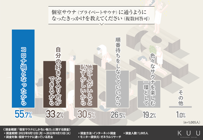 きっかけとしては、やはりコロナ禍となったことで密を避けるために個室サウナに通い始めた方が多いようですが、自分の好きなように設定してサウナに入れることなども、サウナーさんを惹き付ける要素となっている様子がうかがえる結果となりました。