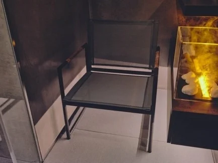上品なグレーのパウダーコート仕上げで、シート生地はフランス・セルジュ・フェラーリ社の BATYLINE を使用しており、KUUで“ととのう“ための最高のチェアとして採用しております。