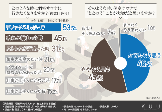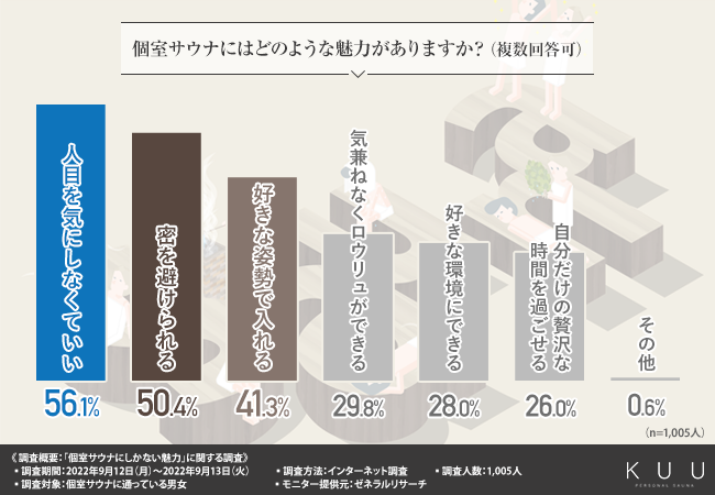 そこで今回、表参道で完全個室サウナを提供する「パーソナル・サウナ KUU」(https://sauna-kuu.com/)は、個室サウナに通っている男女を対象に、「個室サウナにしかない魅力」に関する調査を実施しました。