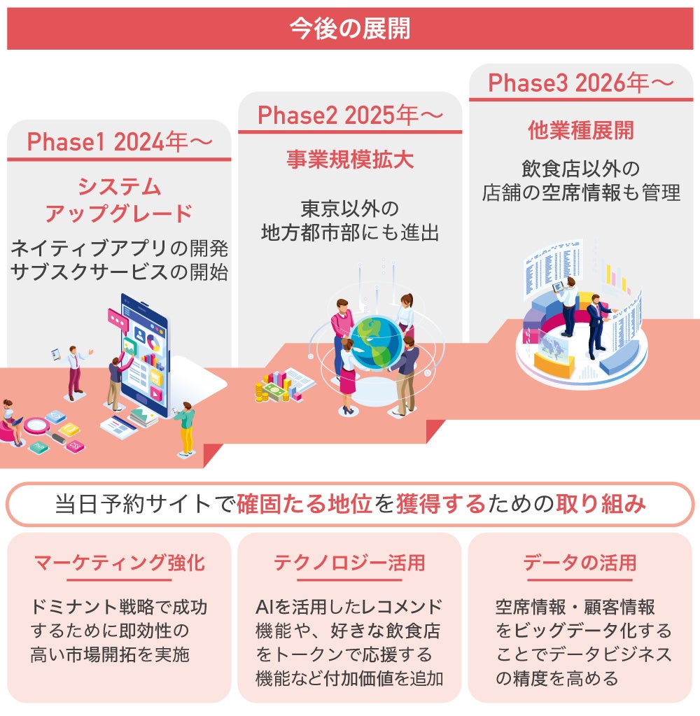 2023年中は今回調達した資金を活用し、都内でも多くの需要が見込まれる新橋を含む東京都心の東エリアで加盟店数を拡大することで、当日予約に不満を抱える潜在個人ユーザー層をスピーディーに獲得していきます。