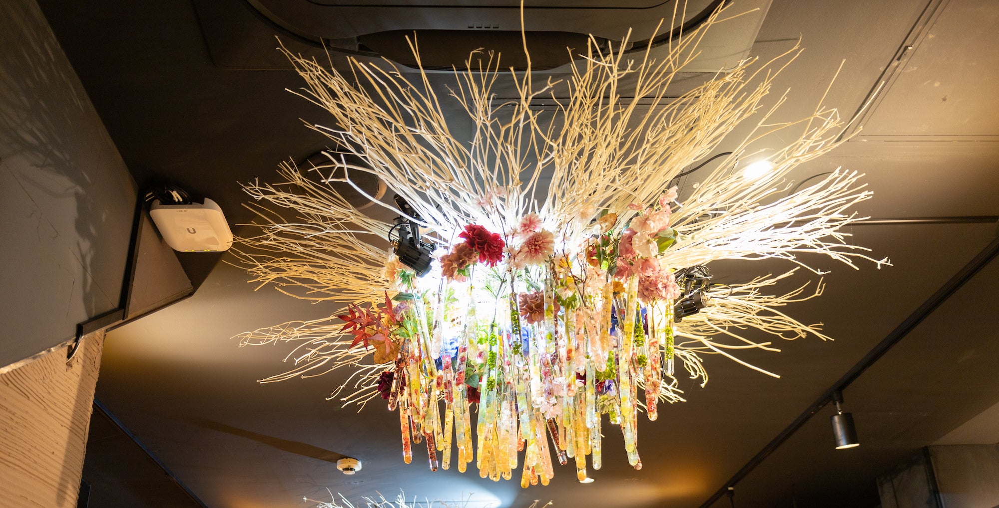 花びらをモチーフにしたエントランスをくぐって店内に入ると、天井には『お花のシャンデリア』が華やかで、かつ艶やかに咲き誇っています。これらの装飾はすべて、花作家:宮内先生の作品です。オバマ大統領の来日時のお花の作品や最近では東京五輪パラリンピックの聖火の桜の装飾などをはじめ、数々の作品で人々の心を和ませてこられた宮内先生が紡ぎだすお花の空間に囲まれて、街の喧騒を忘れるひと時を過ごせます。
