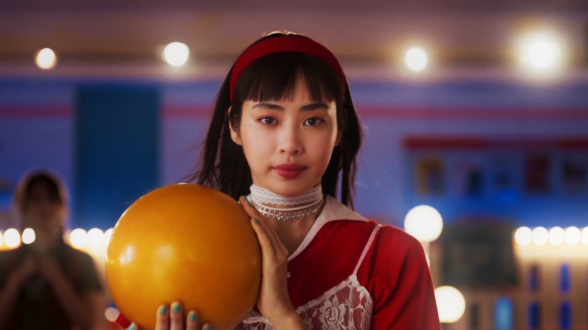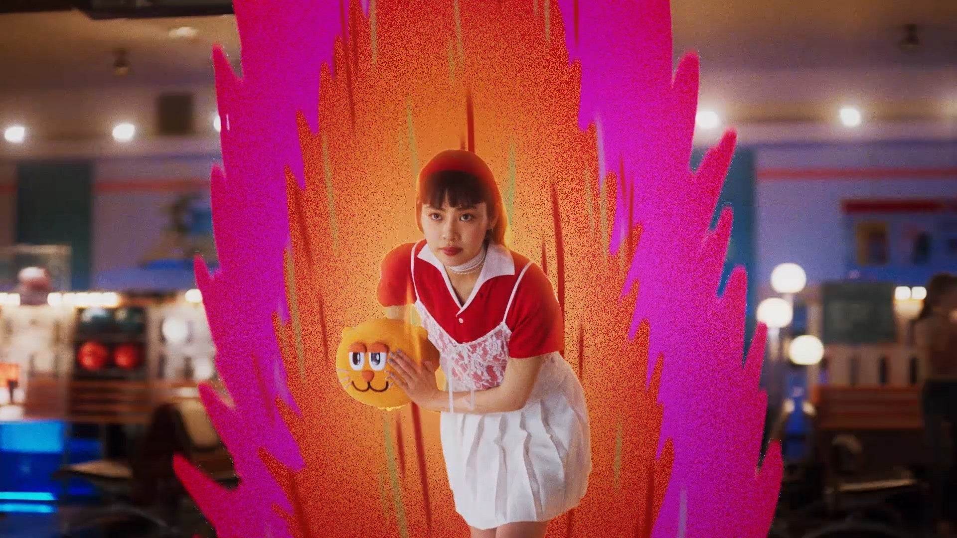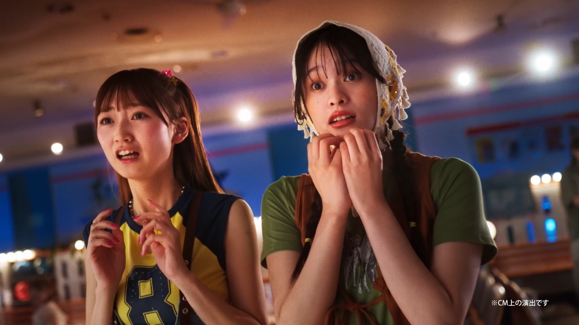 アメリカンテイストなレトロ可愛い衣装を身に纏い登場した三浦杏花さんと、友人役のお二人。レトロにライティングされたボウリング場に、終始わくわくした表情を浮かべていました。壁にかけられたポスターがその日限りのオリジナルであることを知ると、小道具や美術セットに興味津々な様子も。