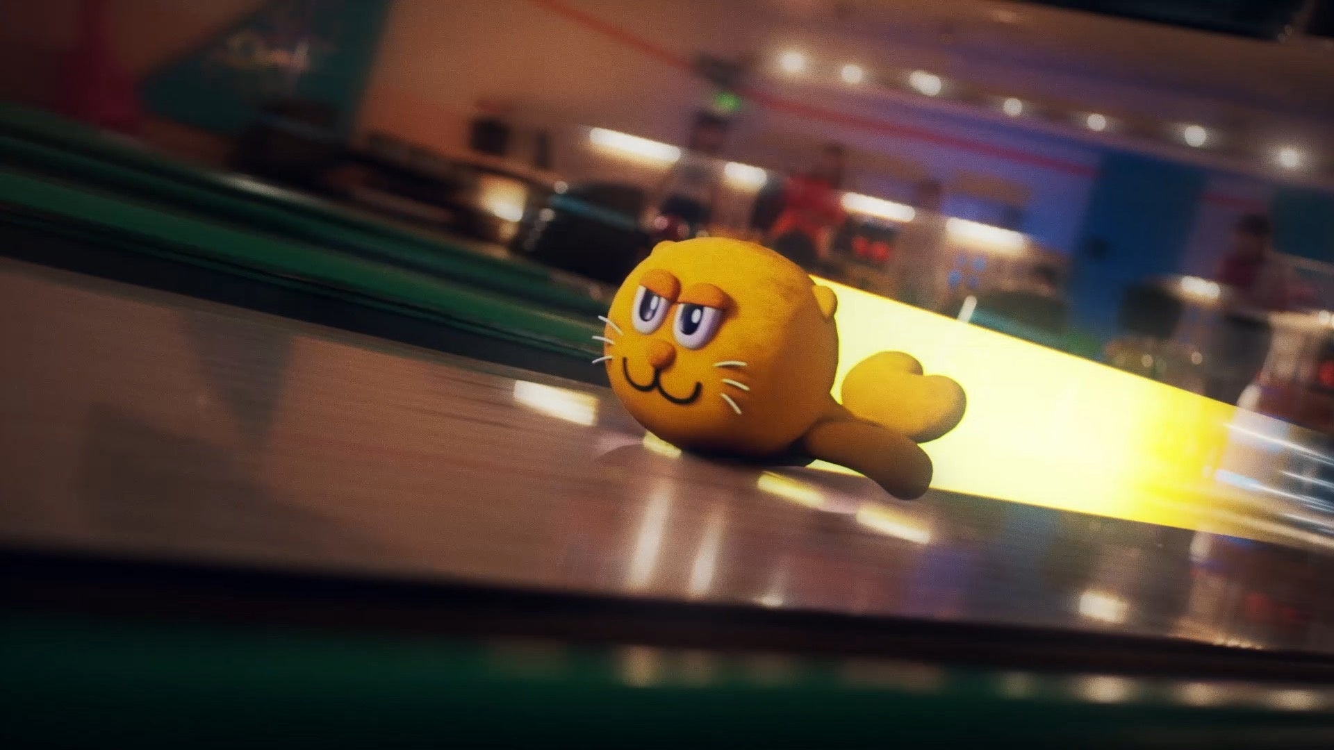 そこへ、「ルシアシカ」ボールを手にした主人公が颯爽と登場。勢いよくボールを投げると、ルシアシカは炎のオーラをまといながら一直線にレーンを駆け抜け、毛根ピンを豪快に破壊!爽快なストライクが決まり、主人公はルシアシカとハイタッチで喜びを分かち合います。