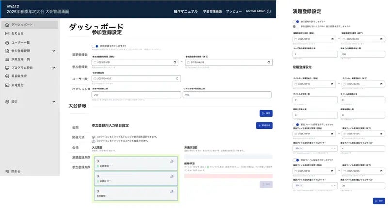 初期設定項目と運用項目を明確に分離することで、準備期には基本設定に集中し、開催期には運営業務に専念できる設計に。直感的なUIとワークフロー最適化により、操作ミスを大幅削減。事務局の負担を軽減しつつ、運営の質を向上させる次世代インターフェースです。