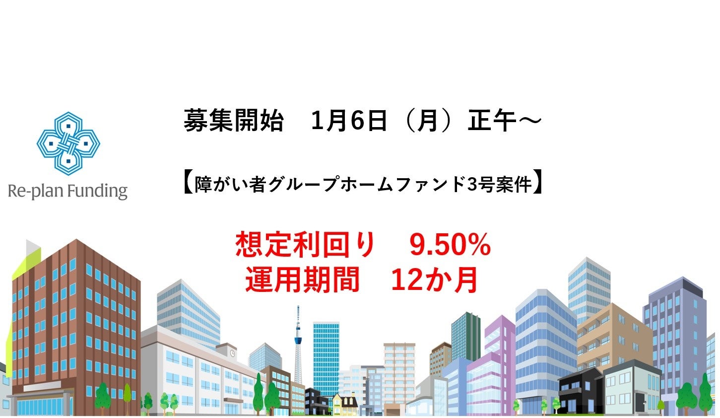 株式会社リプラン(本社:神奈川県横浜市港北区、代表取締役:三浦 洋平)は、不動産投資型クラウドファンディングサービス「Re-plan Funding」において、2024年12月10日より「インカム型 第3号グループホームファンド」の掲載をいたしますので、お知らせします。