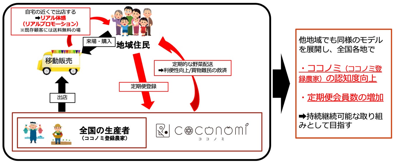 ココノミとモビマルが連携することにより、地域の消費者と農家がリアルな接点を持つことができ、こだわりの野菜を体験・購入する機会を消費者に提供することで、生産者を応援してまいります。