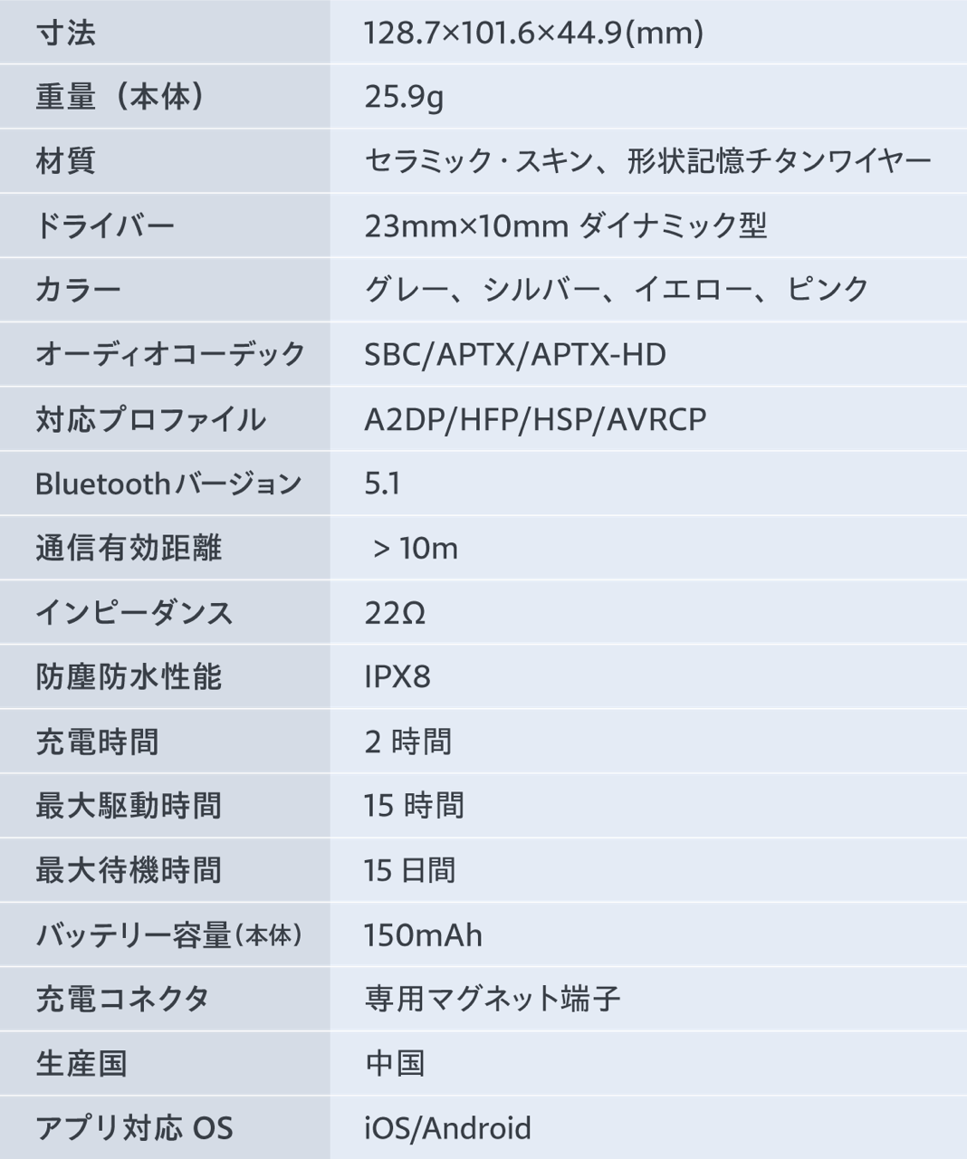 耳の裏側に位置するバッテリー部には、大容量150mAhのリチウムイオンバッテリーを搭載。製品単体で最大15時間再生が可能です。さらに15分の充電で最大5.3時間再生の急速充電にも対応しています。独自の省エネ技術「Energy Lock」により、バッテリーの消費電力を抑えながら、本体の軽量化(25.9g)を実現しました。