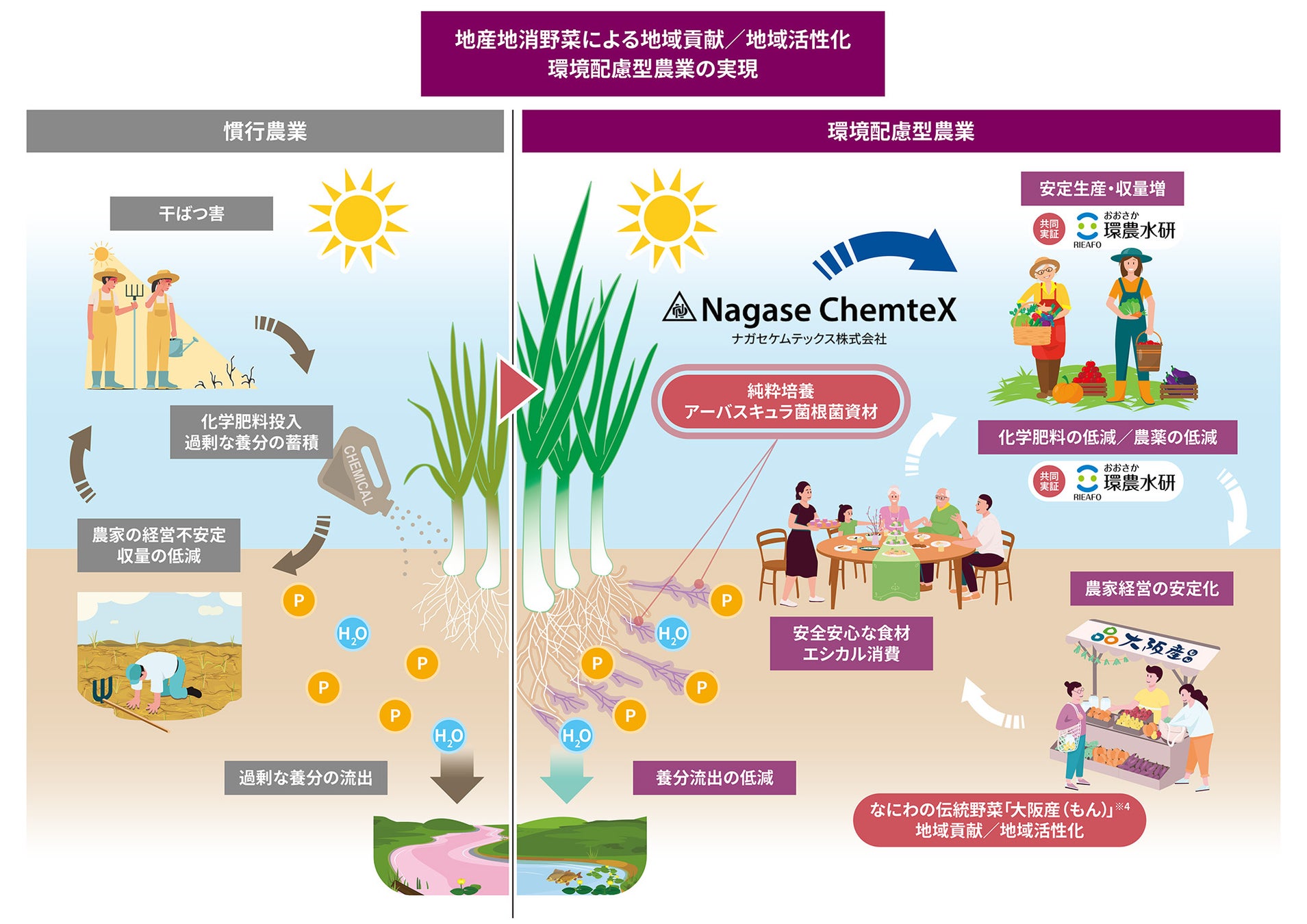 この課題を解決するため、ナガセケムテックスは2023 年度に、⼤阪環農⽔研に委託して圃場栽培研究をスタートしました。