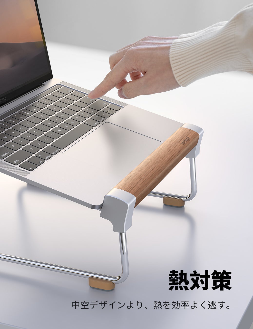 本体には高強度アルミ合金を使用しているため、加圧に対する強度を強化できます。また、手が当たっても痛くないよう、丸みを帯びたフォルムに仕上げました。パソコン接触面と卓上接触面にはラバーが取り付けられており、タイピング時の揺れを最小限に抑えます。重量は435gと、ガタつきもなく安定感のあるしっかりとした重さでありながら、持ち運びの際も負担になりません。中空デザインなので、ごちゃごちゃしがちなデスクの作業スペースの確保にも役立ちます。