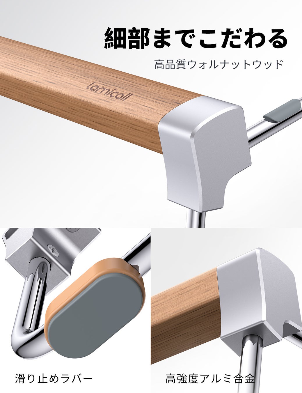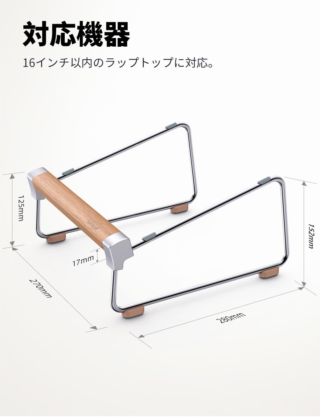 アルミ部分をウォールナットのロッドにはめ込むだけなので、取り付けも簡単。ネジや接着剤などの工具も必要なく、商品が届いてから数秒で使い始めることが可能です。16インチ以内のラップトップであればどんなPCでも対応しています。表面と底面にはシリコンラバーが設置されているため、ラップトップがずれ込んでしまうこともありません。高品質のウォールナット材を使用しているため、複数回取り外しを繰り返しても、滑らかな感触が持続します。