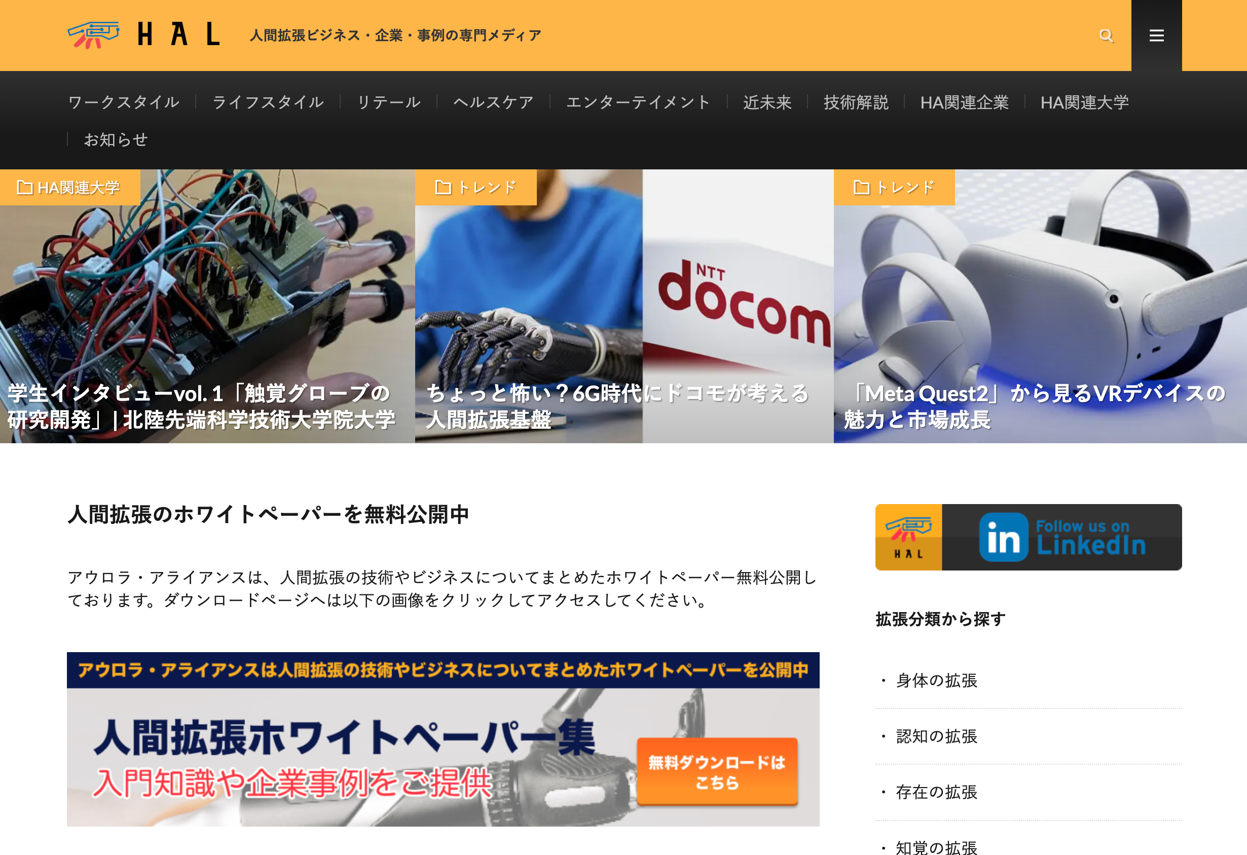 アウロラ・アライアンスは、人間拡張専門メディアであるHuman Augmentation Labo(以下、HAL)にて、人間拡張や関連技術に関するニュースを発信しています。また、調査結果をまとめたホワイトペーパーを発行しており、これまでに2つのホワイトペーパーを公開しました。