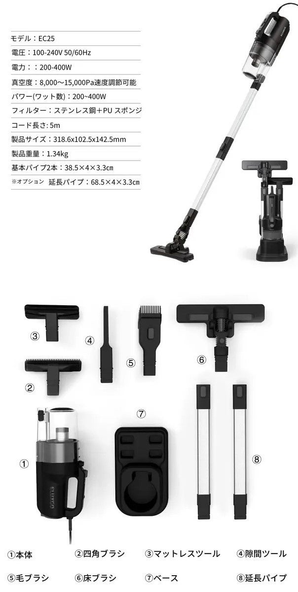 ・実際にシンガポールブランドであるELUXGOのロングノズルを手にした時に、「これで日本の高い所の掃除で困っている方のお手伝いができる!」と確信しました。同メーカーは実直に独自の優れたサイクロン技術を開発し、いくつも掃除機を研究開発し各国に幅広く販売している優れたメーカーです。この度日本販売用に日本の家屋に合わせてコードも5mに変更しました。お掃除モップ要らずの5つのノズルで家中掃除が可能です。ついつい楽しくて余計なところまで掃除をしてしまいます。あえてコード式だからこそのハイパワー・軽量ボディで高所掃除も床掃除も困りません。日本の皆さんにお届けするのが楽しみです!