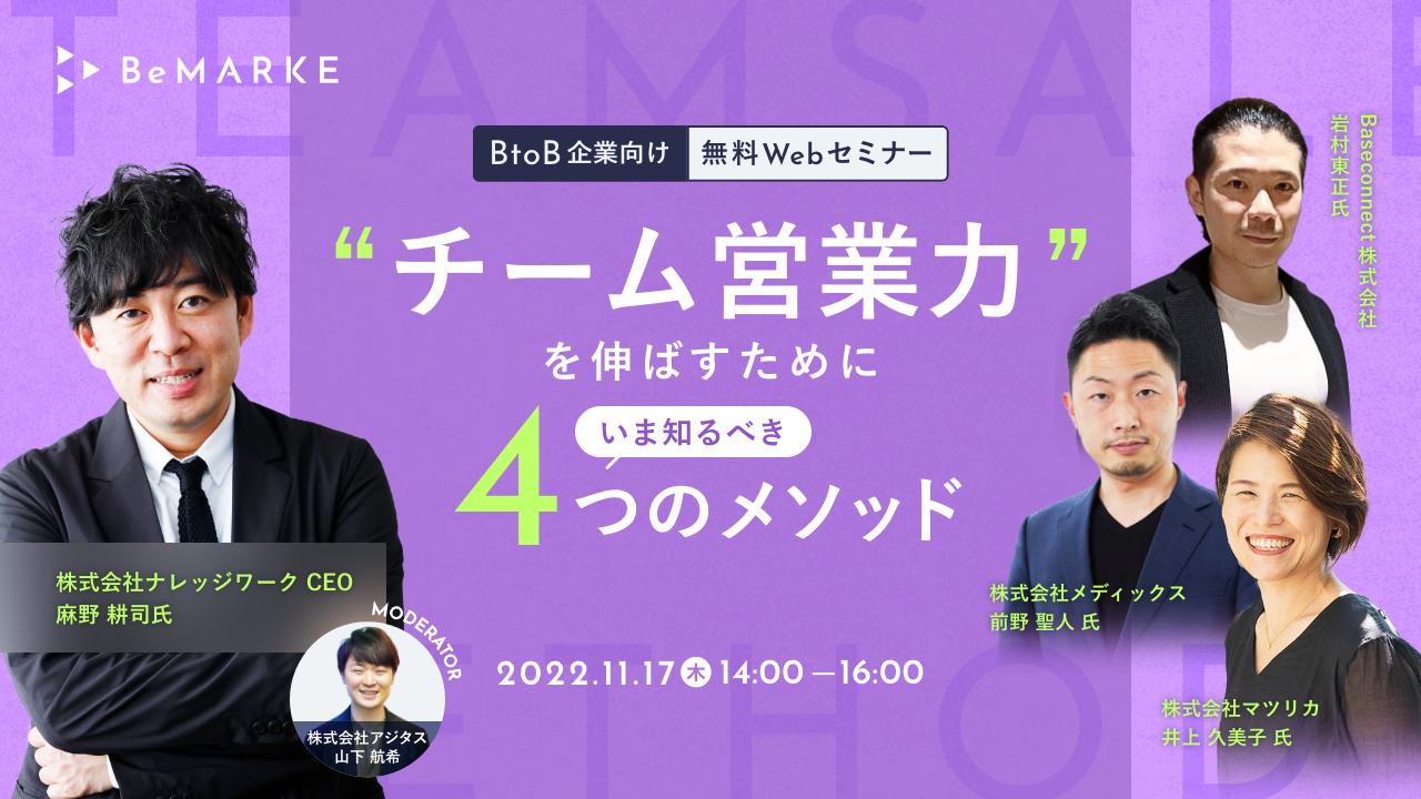BtoBマーケティングに関する情報を発信するメディア「BeMARKE(ビーマーケ)」を運営する、株式会社アジタス(宮城県仙台市、代表取締役社長 小原 琢麿)は、Baseconnect株式会社、株式会社メディックス、株式会社ナレッジワーク、株式会社マツリカと共催で、11/17(木)14:00より「【明日から実践】 BtoB企業が“チーム営業力” を伸ばすために今知るべき4つのメソッド」を開催します。