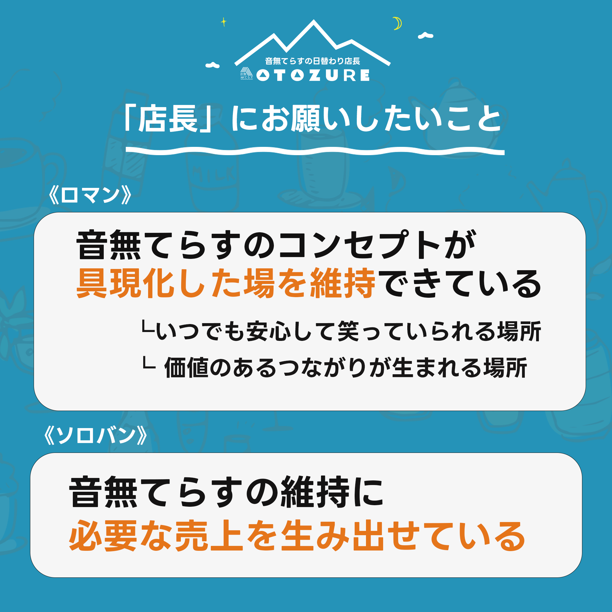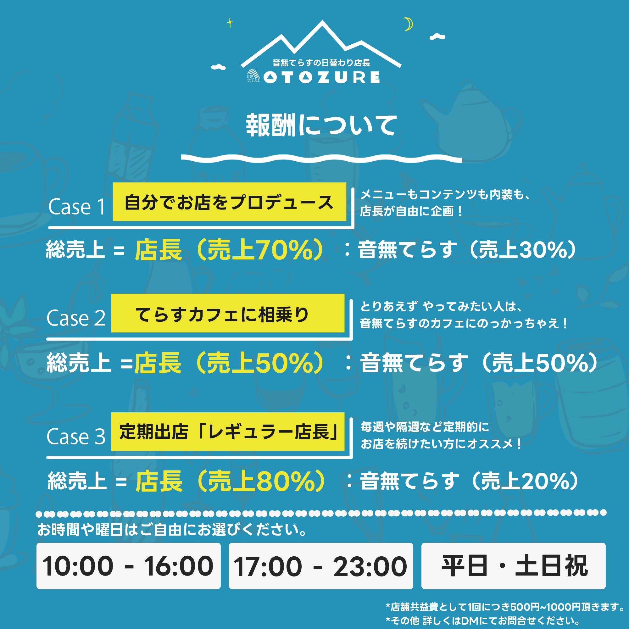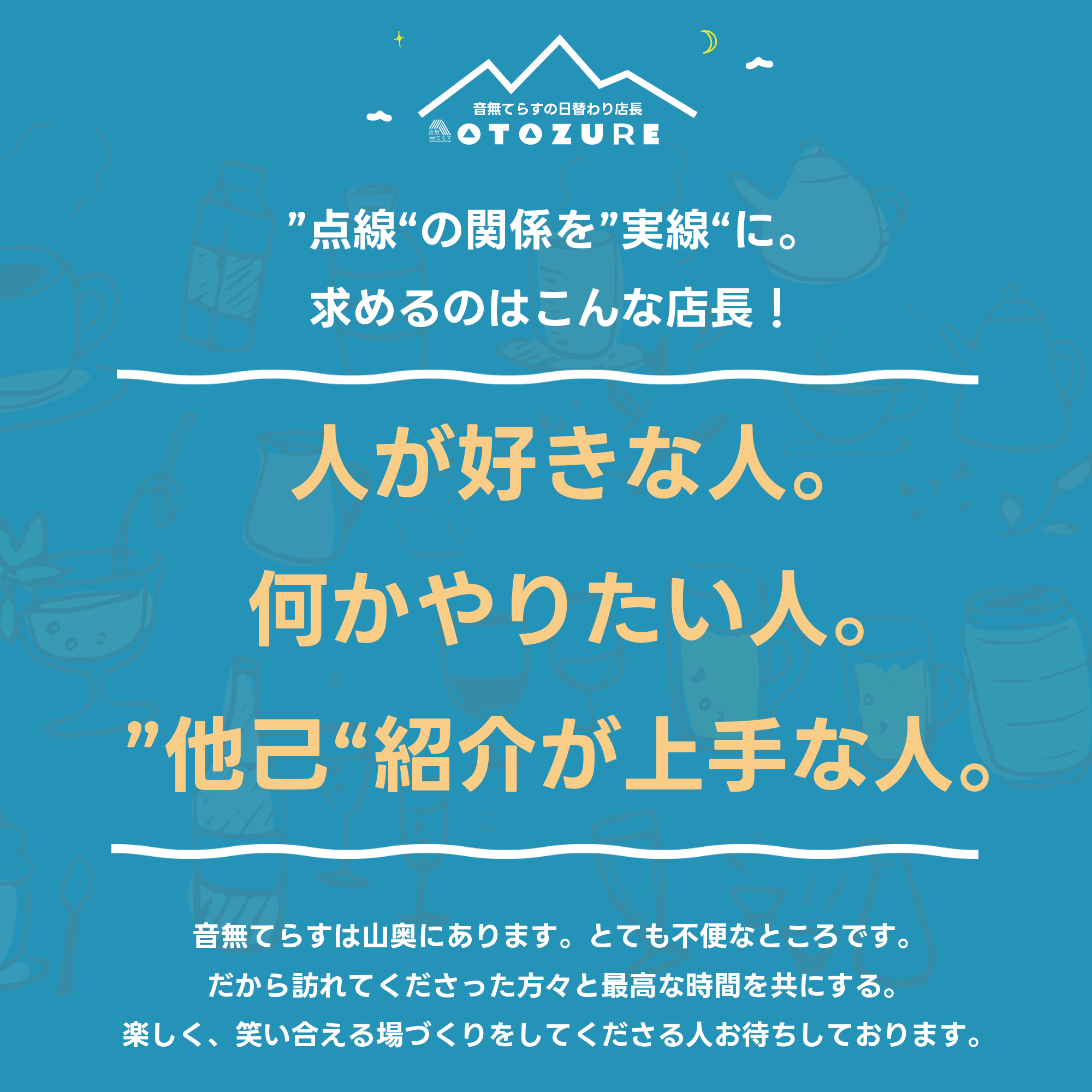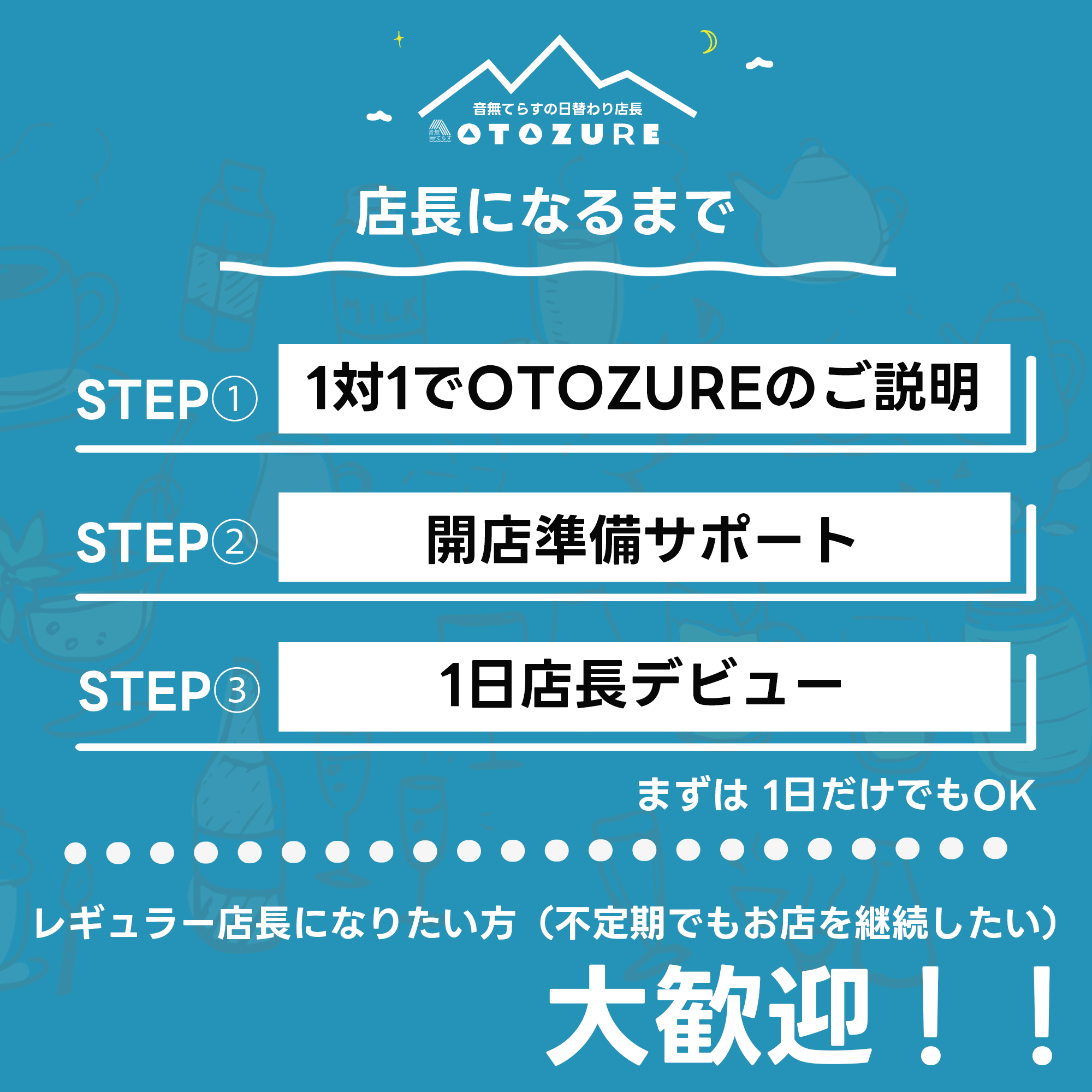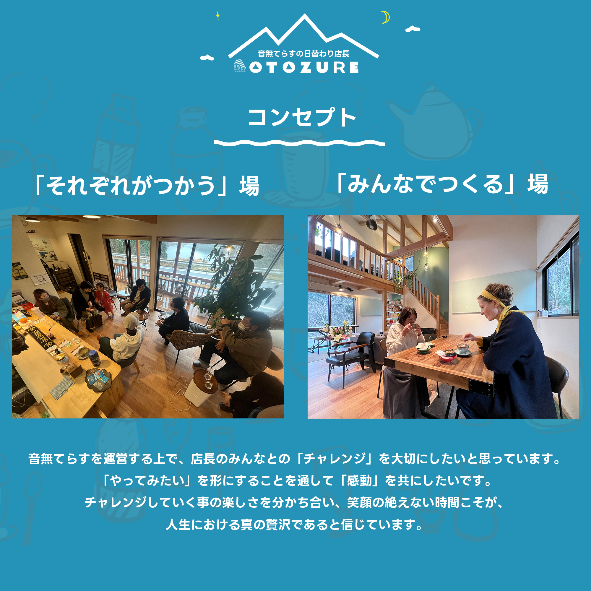 出来上がっているモノではなく。出来上がる過程を楽しんでもらいたい。「OTOZURE(おとずれ)」という名前に込めた想いです。店長になってくださる方々と、そこに訪れてくださるお客様の両側面が持っている音をセッションし、新しい音を生み出してもらいたい。いわゆる”チャレンジをする場”を提供したいと思いました。セラピスト、農家、作家、デザイナー、税理士、会社員、歯医者、ゲストハウスオーナーなどなど。日一度はやってみたいと夢見ていた「チャレンジ」を是非してみてください。