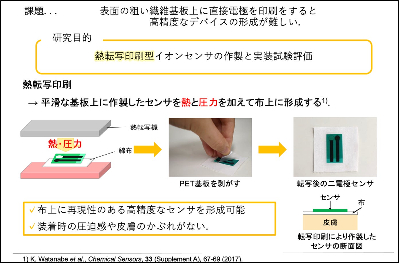 開発したイオンセンサを熱転写印刷で衣類に取り付けることで、ウェアラブルデバイスとして使用可能であることを実証しました。