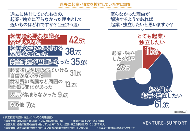 - 知識や資金調達での準備不足から、起業・独立を断念している人が多い