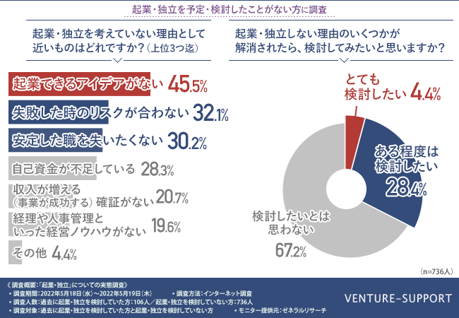 結果、約4割が起業できるアイデアがない(45.5%)と回答し最多。その他、「失敗した時のリスクが合わない」、「安定した職を失いたくない」などリスクへの懸念もみられた。