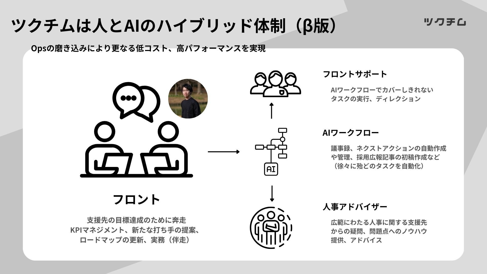 弊社は、生成AIコンサルティングや開発支援を行なっているスタートアップです。人材採用は初期から非常に重要な要素のため、ツクチムさんとご一緒する機会を得ました。