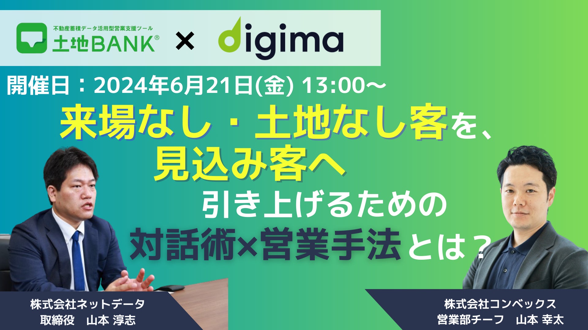 900社導入の土地付け営業マップツール「土地バンク」を提供する、株式会社ネットデータ(本社:岡山県岡山市、代表取締役 松岡 明)は、住宅・不動産業界に特化したマーケティングオートメーションツール「Digima」を運営する株式会社コンベックス(本社:東京都渋谷区、代表取締役:美里泰正、以下コンベックス)と工務店・ハウスメーカー様向けのタイアップセミナーを開催いたします。