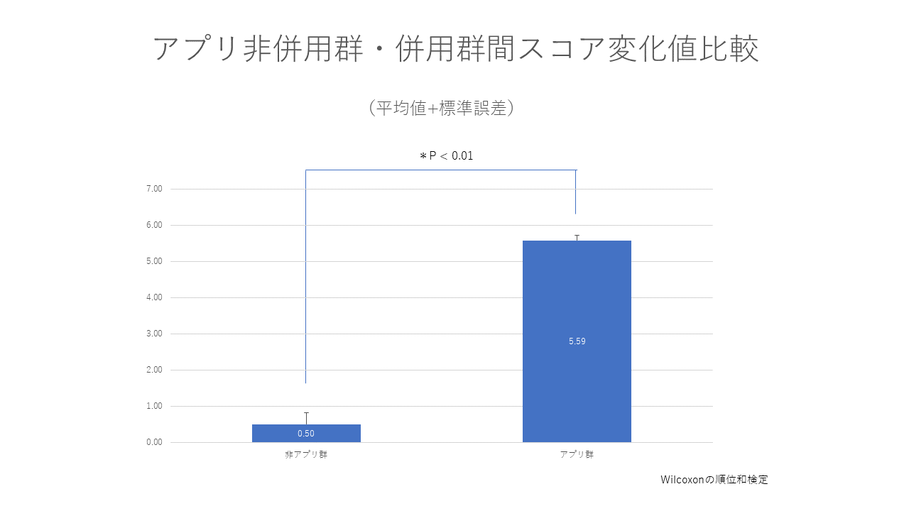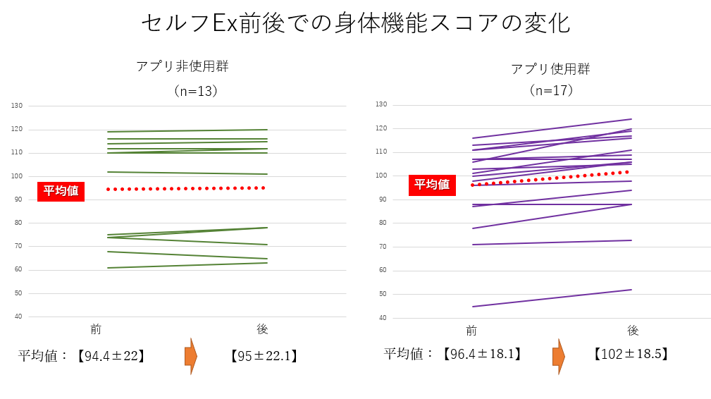 一方アプリを併用すれば、短期間ながらもリハビリで「身体機能を向上させ得ること」が示され、そのためには自宅でのセルフEX を補助するアプリが必要不可欠と思われる。