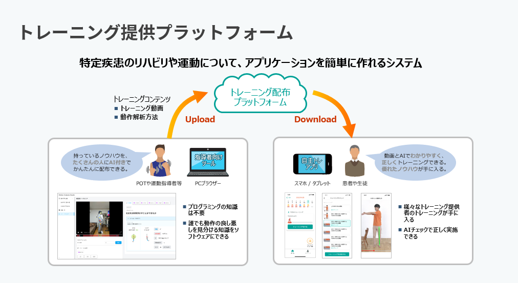 さらに、本サービスはオープンプラットフォームとなっており、リハビリや運動のノウハウを持つ指導者が誰でも自由にトレーニングコンテンツやAI解析を定義し、アプリとして利用者に提供することができるようになっているのが大きな特徴です。