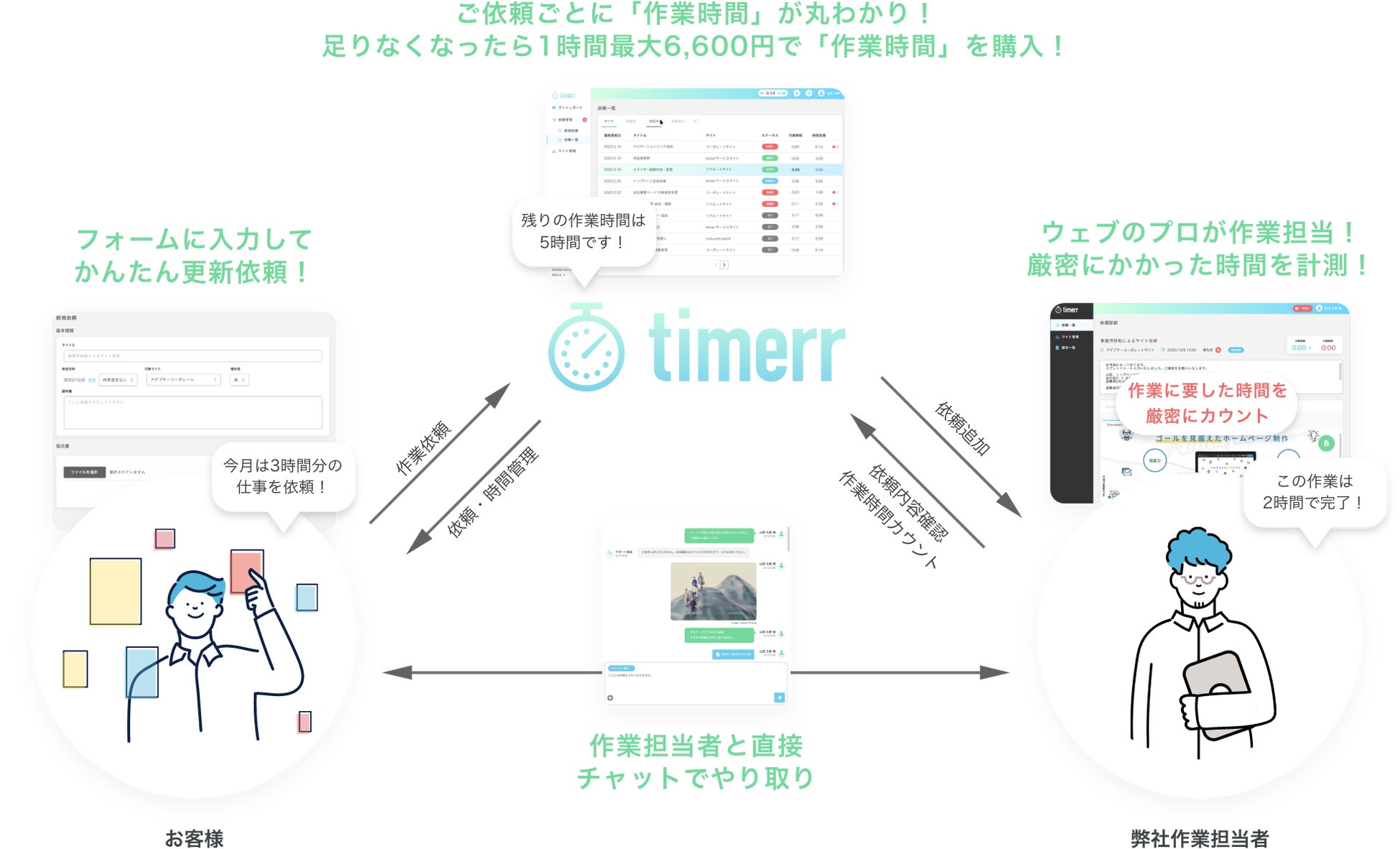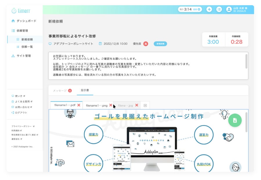 timerr(タイマー)はホームページの修正・更新作業やデザイン業務を、担当者の「時間」を使って、ウェブ上で簡単に依頼できるサービスです。