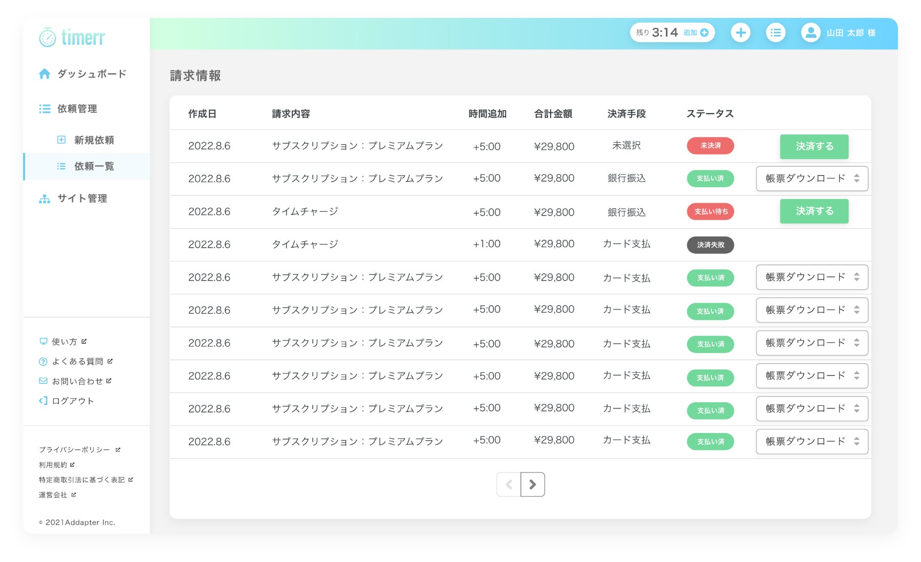 過去のお支払いについては全て、帳票(請求書)のダウンロードが可能です。再発行も管理画面から行えますので経理の手間を減らせます。
