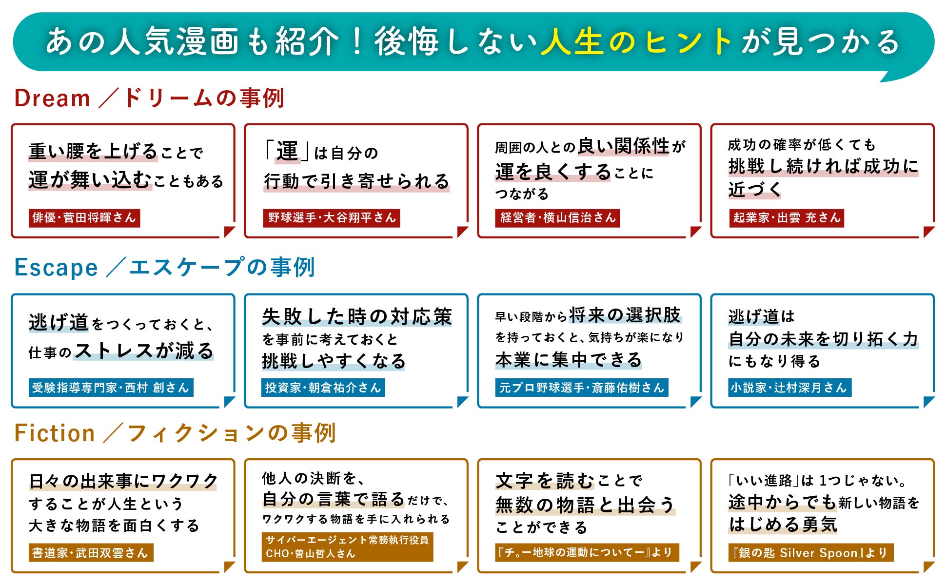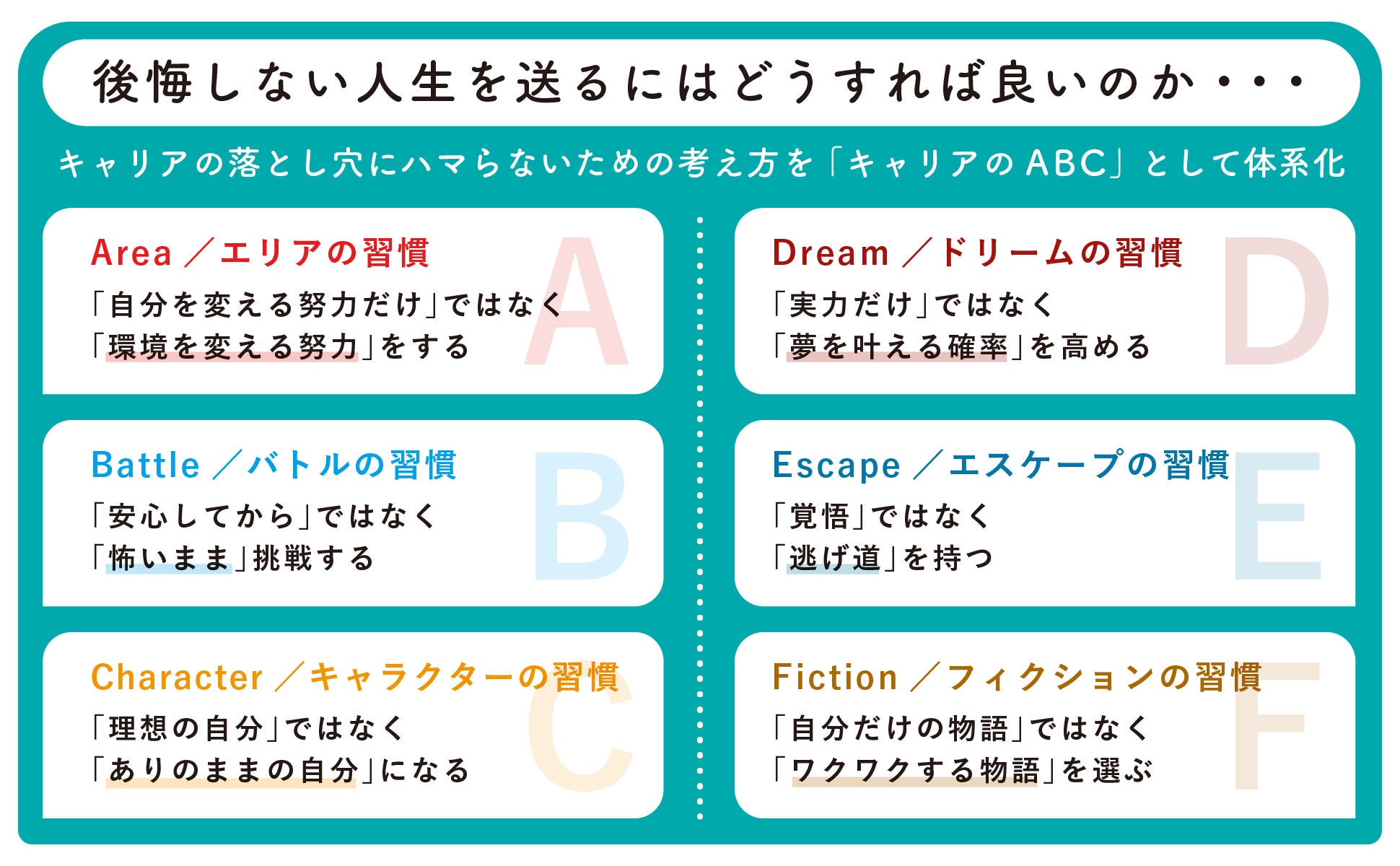 A(Area)、B(Battle)、C(Character)という3つのキーワードをベースに、環境選びや挑戦の仕方、自己理解の深め方を紹介。さらにD(Dream)、E(Escape)、F(Fiction)という概念も取り上げ、後悔しない人生を送るための、キャリア形成のコツをわかりやすく解説しています。