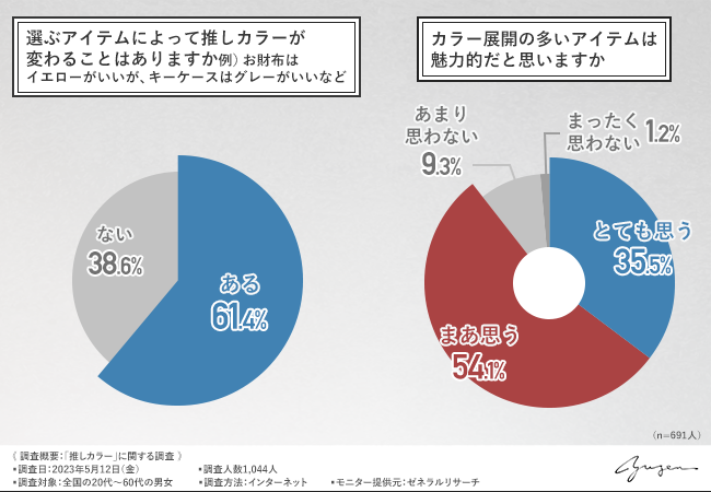 「選ぶアイテムによって推しカラーが変わることはありますか例)お財布はイエローがいいが、キーケースはグレーがいいなど」と質問したところ、6割以上の方が『ある(61.4%)』と回答しました。