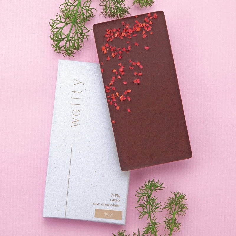 「wellty chocolate」は、カカオ豆に含まれるビタミンやミネラルなどの栄養や酵素が最大限含まれるよう、焙煎を必要最低限にしたローチョコレートです。乳化剤や香料、乳製品などを使用せず、甘味料に生はちみつまたはデーツシロップを使用することで、美と健康にプラスになるチョコレートに仕上げました。また、カカオ農家に正当な賃金を支払うフェアトレードのカカオ豆を使用したり、チョコレート1枚あたり15円を環境保護団体などに寄付したりと、手にとっていただくことによって人や社会、環境に配慮したエシカルなチョコレートとなっております。