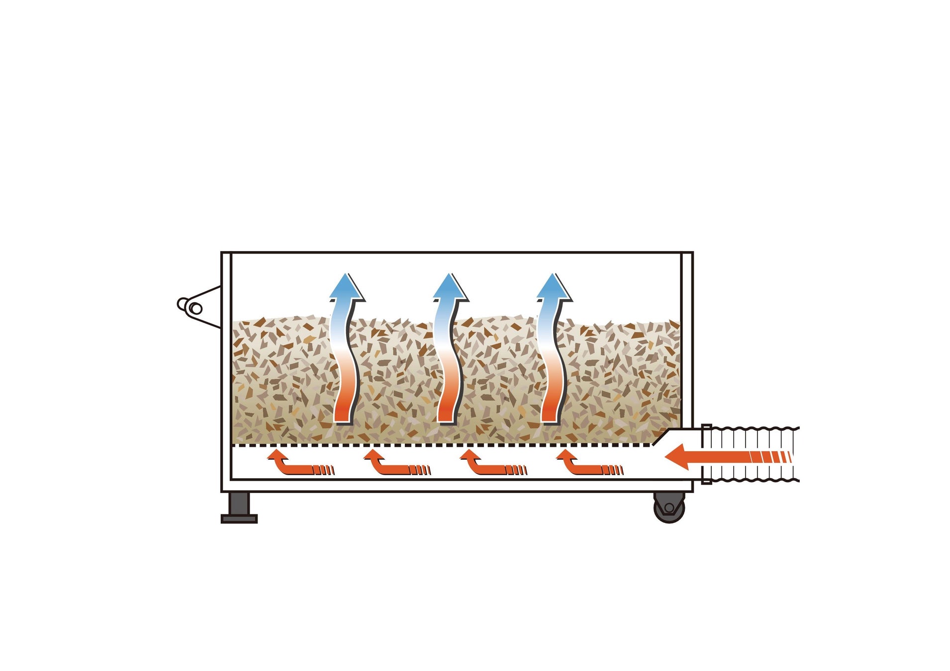 ・温風を熱源に、コンテナで木質チップを乾燥させる。