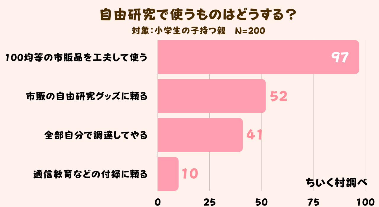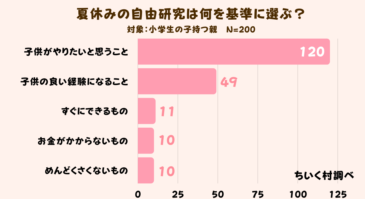 夏休みの自由研究は何を基準に選ぶのか調査した結果、200人中120人の方が「子供がやりたいと思うこと」と回答していました。