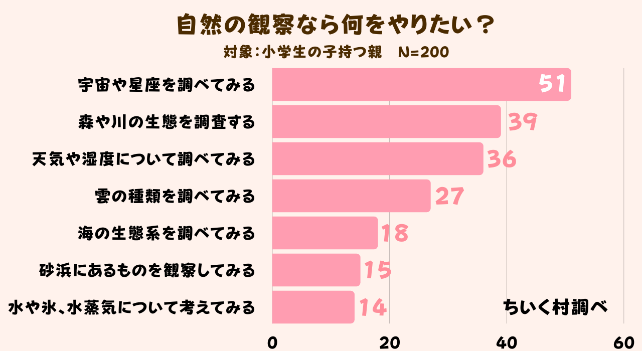 夏休みの自由研究の1つ自然観察で何をやりたいか具体的に調査した結果、「宇宙や星座を調べてみる」が200人中51人で1番人気であることがわかりました。