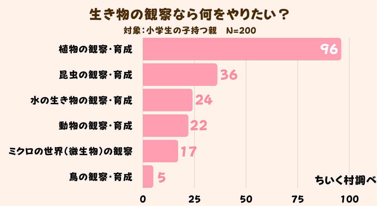 夏休みの自由研究で2番目に人気だった生き物の観察で何をやりたいか具体的に調査した結果、植物の観察・育成が200人中96人で1番人気であることがわかりました。