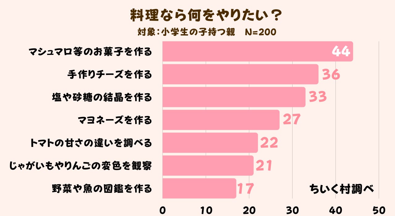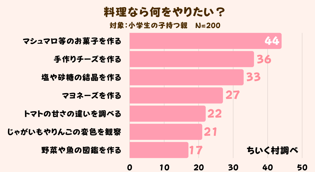 夏休みの自由研究の1つ「料理」で何をやりたいか具体的に調査した結果、「お菓子を作る」が200人中44人で1番人気であることがわかりました。