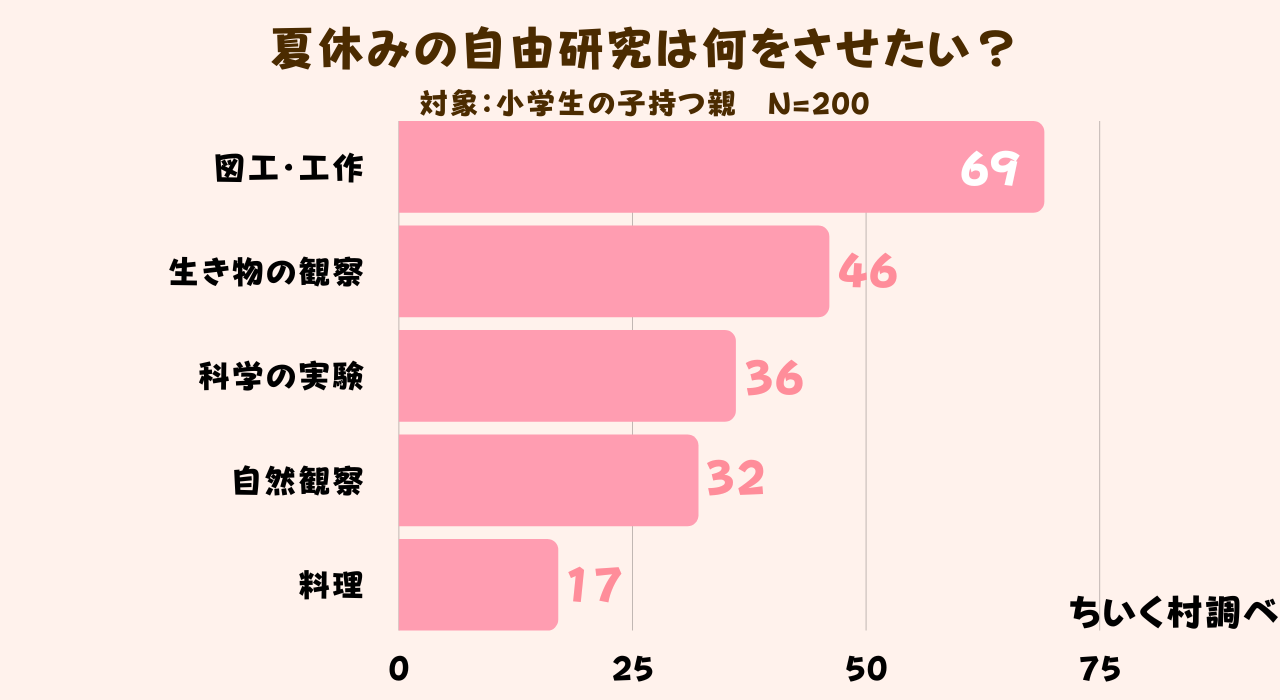夏休みの自由研究で子供にどんなことをやらせたいか調査した結果、200人中69人の方が「図工・工作」と回答していました。