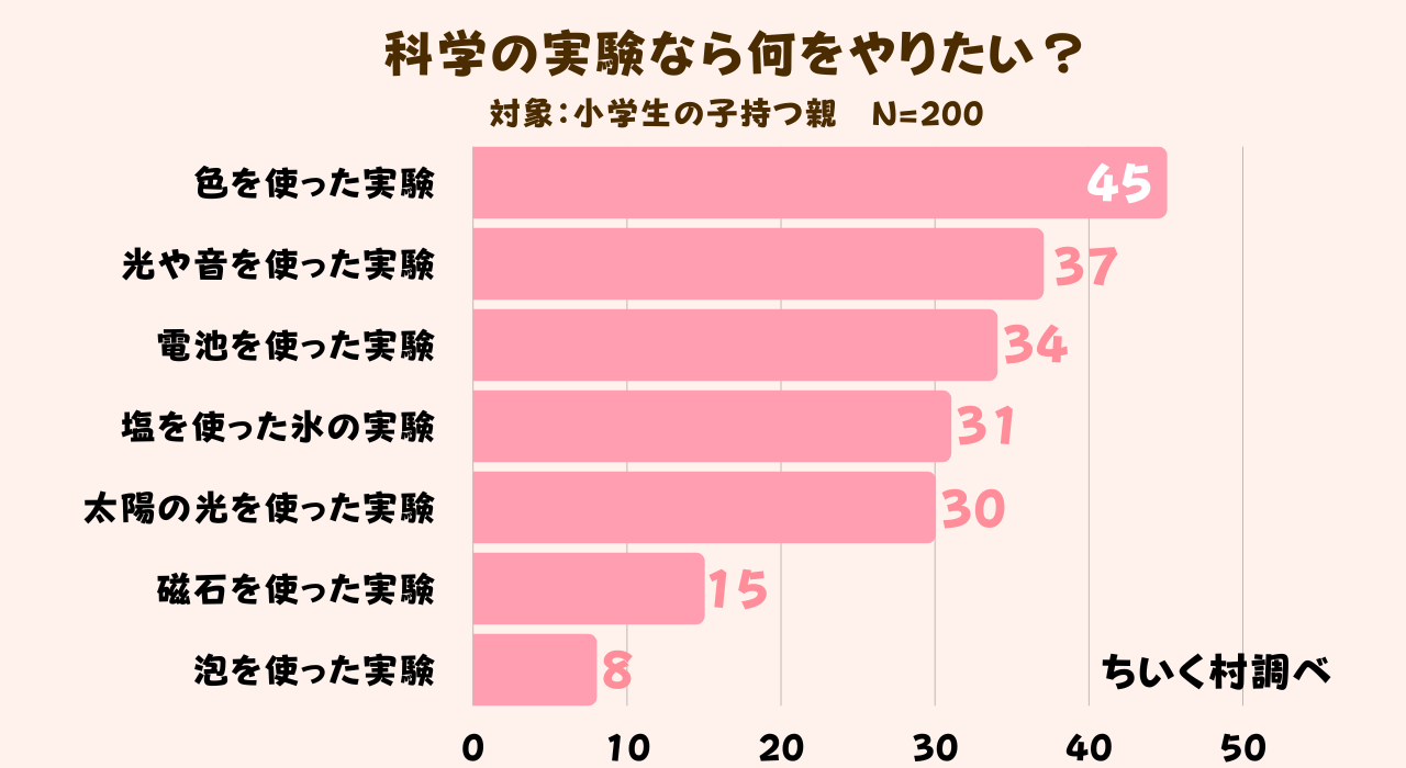 夏休みの自由研究で3番目に人気だった科学の実験で何をやりたいか具体的に調査した結果、色を使った実験が200人中45人で1番人気であることがわかりました。