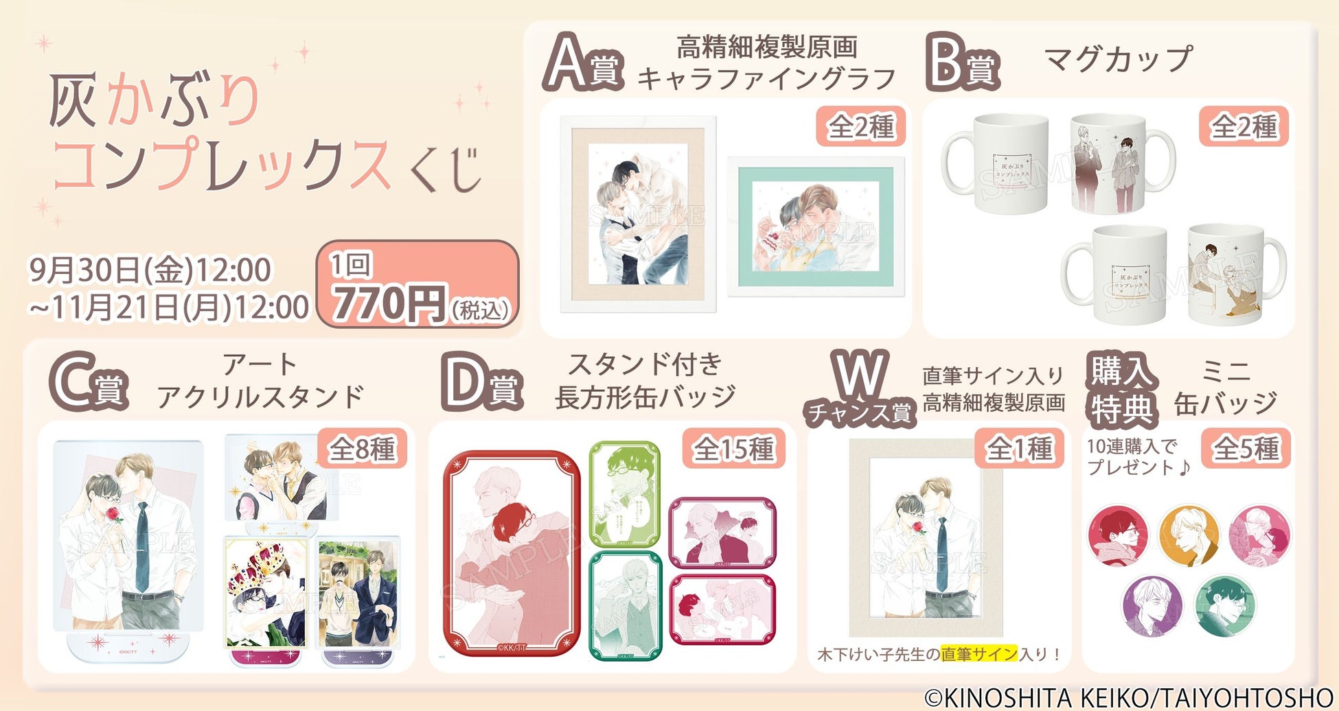 キャラアート株式会社(代表取締役社⻑:井上裕⽂)は、オンラインくじサービス「推しちゃれ」において、ボーイズラブコミック雑誌 ihr HertZ(大洋図書)で大人気連載中の『灰かぶりコンプレックス』(木下けい子/著)の限定グッズが⼿に⼊るオンラインくじを、2022年9⽉30⽇(⾦)12時より販売します。