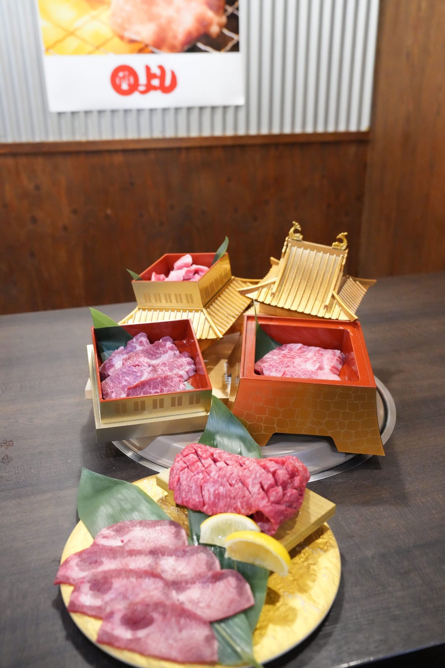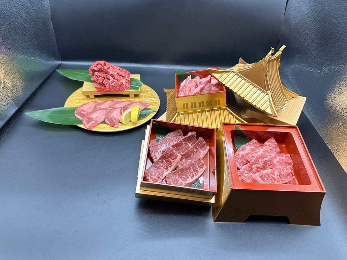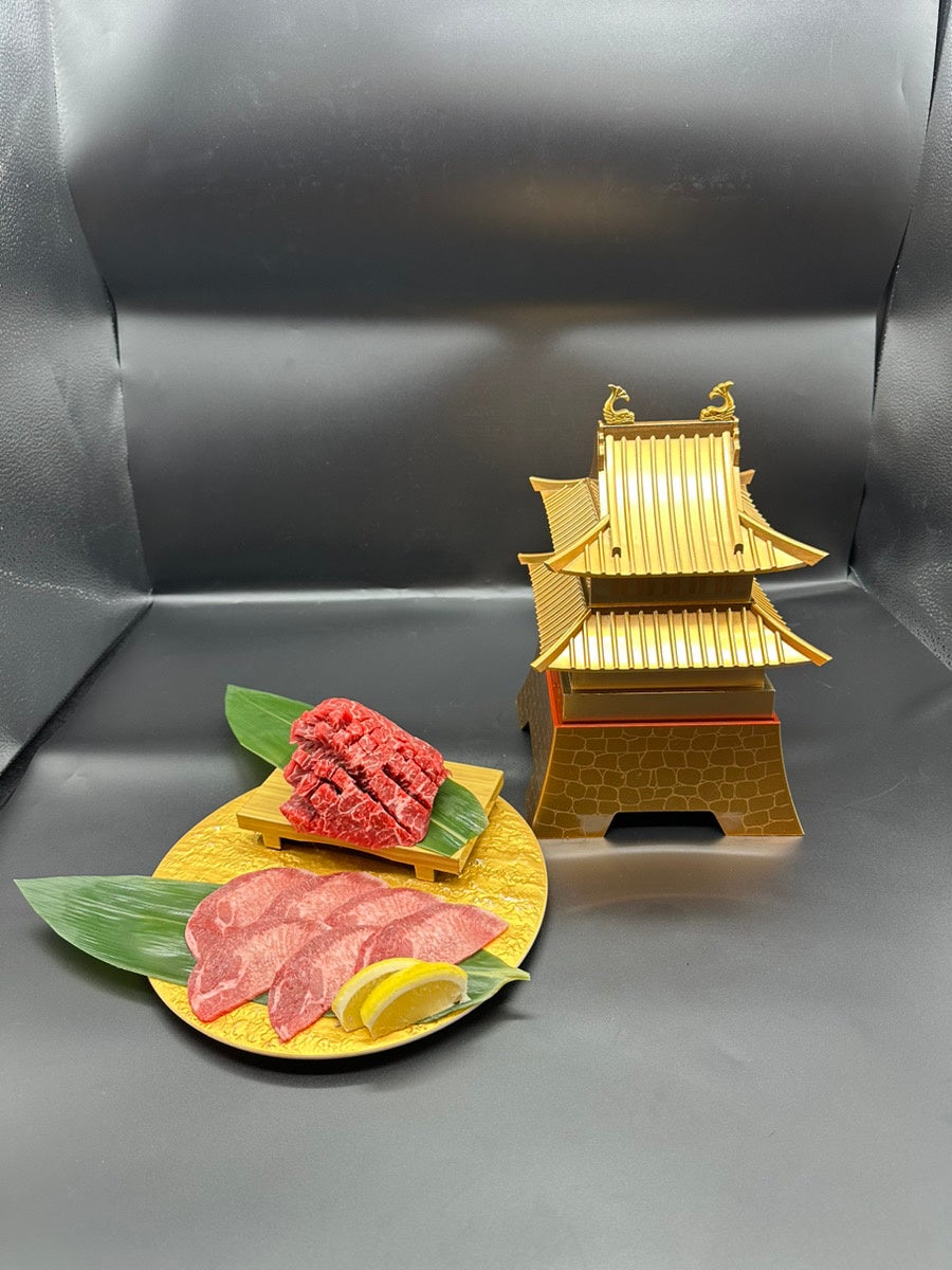 こちらは、大阪城をモチーフに豪華に彩った見た目のみならず、当店でも屈指の上質な牛肉のみを抜選し、盛り合わせにしております。