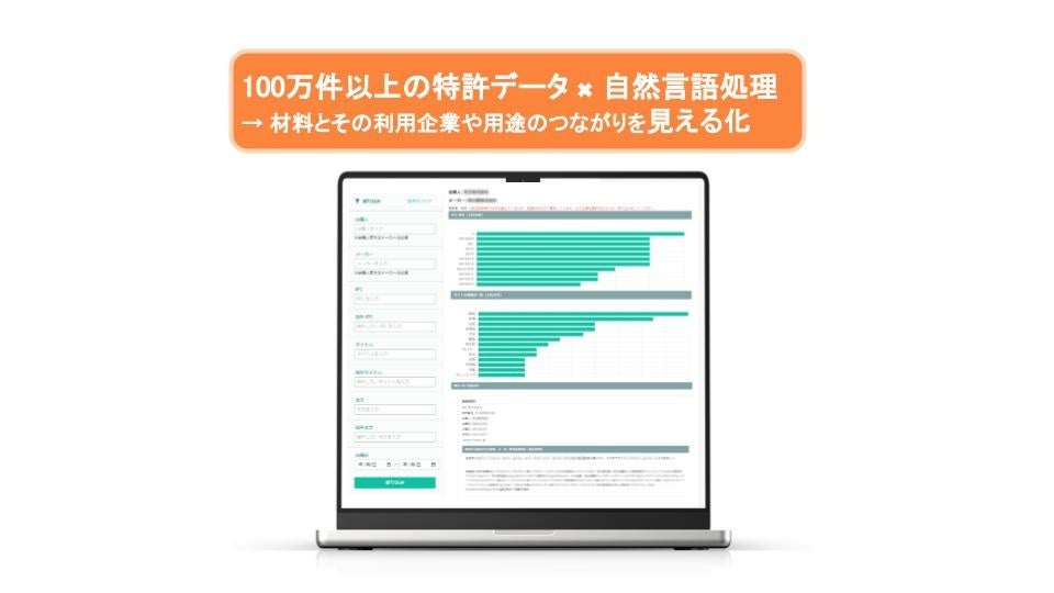 既存機能では原料選定や顧客探索、用途・ニーズの探索、競合分析などが可能でしたが、今回の機能追加により、材料・材料を利用している企業・用途のつながりの見える化が可能となります。100万件以上の特許データと自然言語技術をかけあわせ、自社製品や他社製品がどの企業でどういった用途で利用されているのかを感覚的に把握できます。本機能は無料で、2023年8月2日(水)からご利用いただけます。 ※要無料ユーザ登録